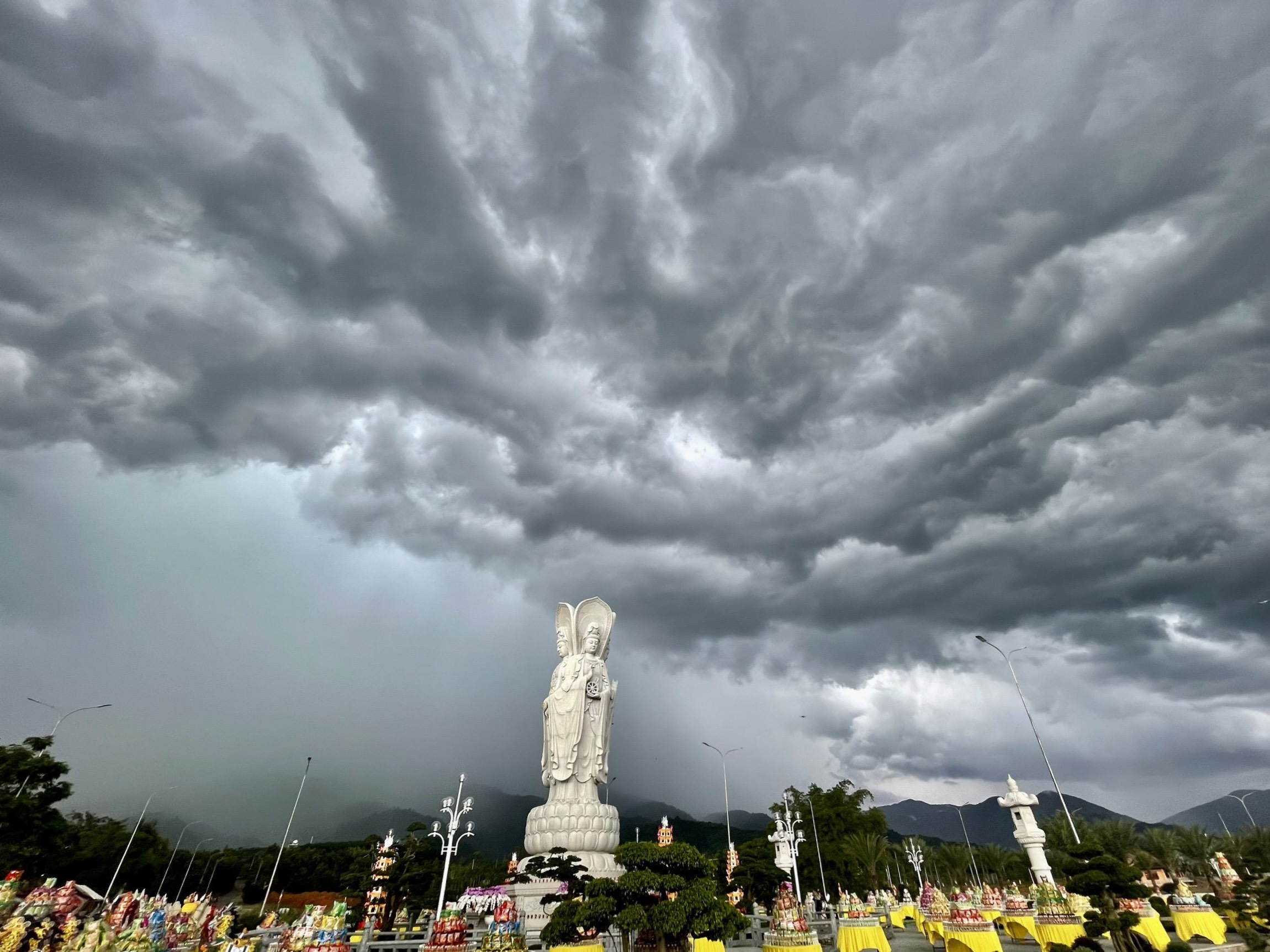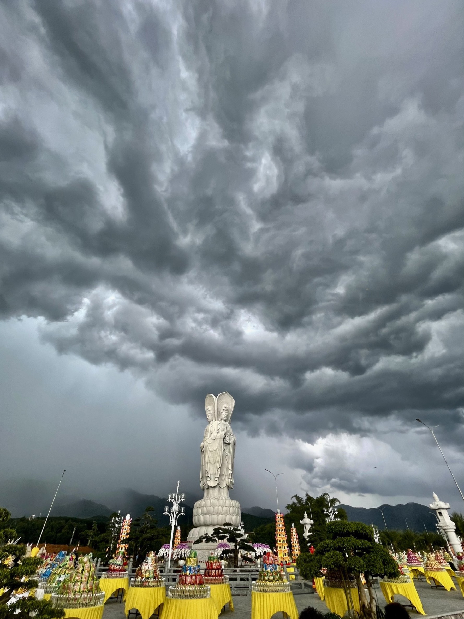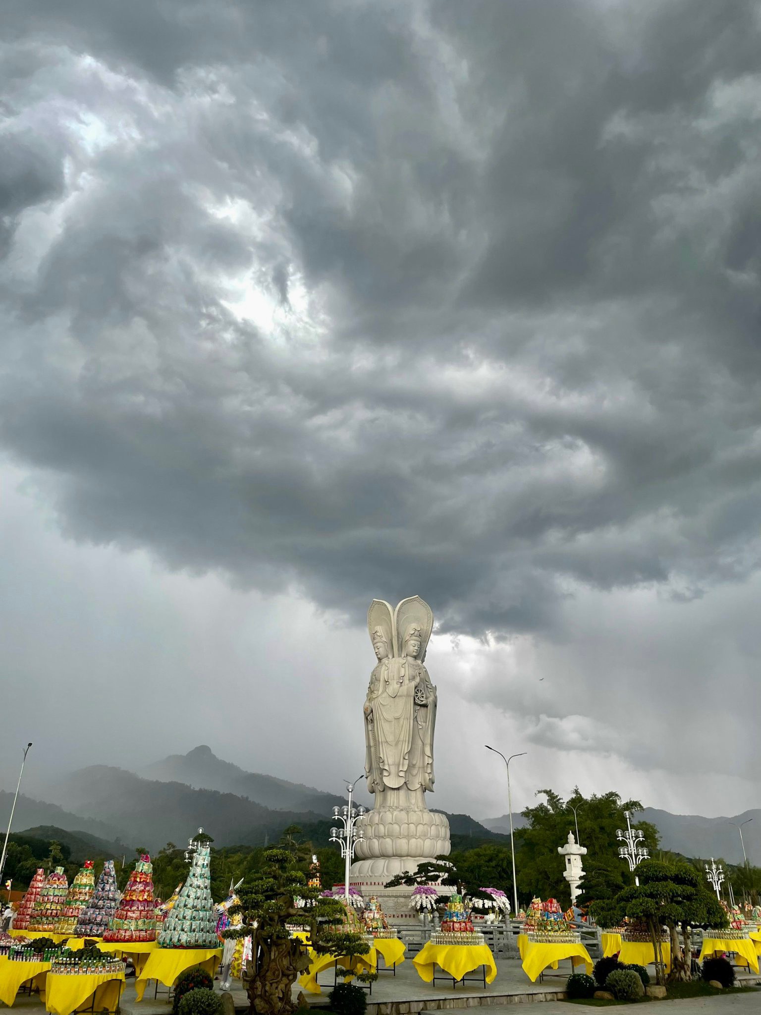 Thời khắc cử hành nghi lễ, hiện tượng thời tiết biến đổi một cách lạ kỳ, bầu trời bỗng tối sầm lại và chùng hẳn xuống, những quầng mây trên khoảng trời bao la chuyển sắc, cuồn cuộn kéo về tụ hội xoay quanh Thánh Tượng Quán Thế Âm Bồ Tát Tứ Diện.