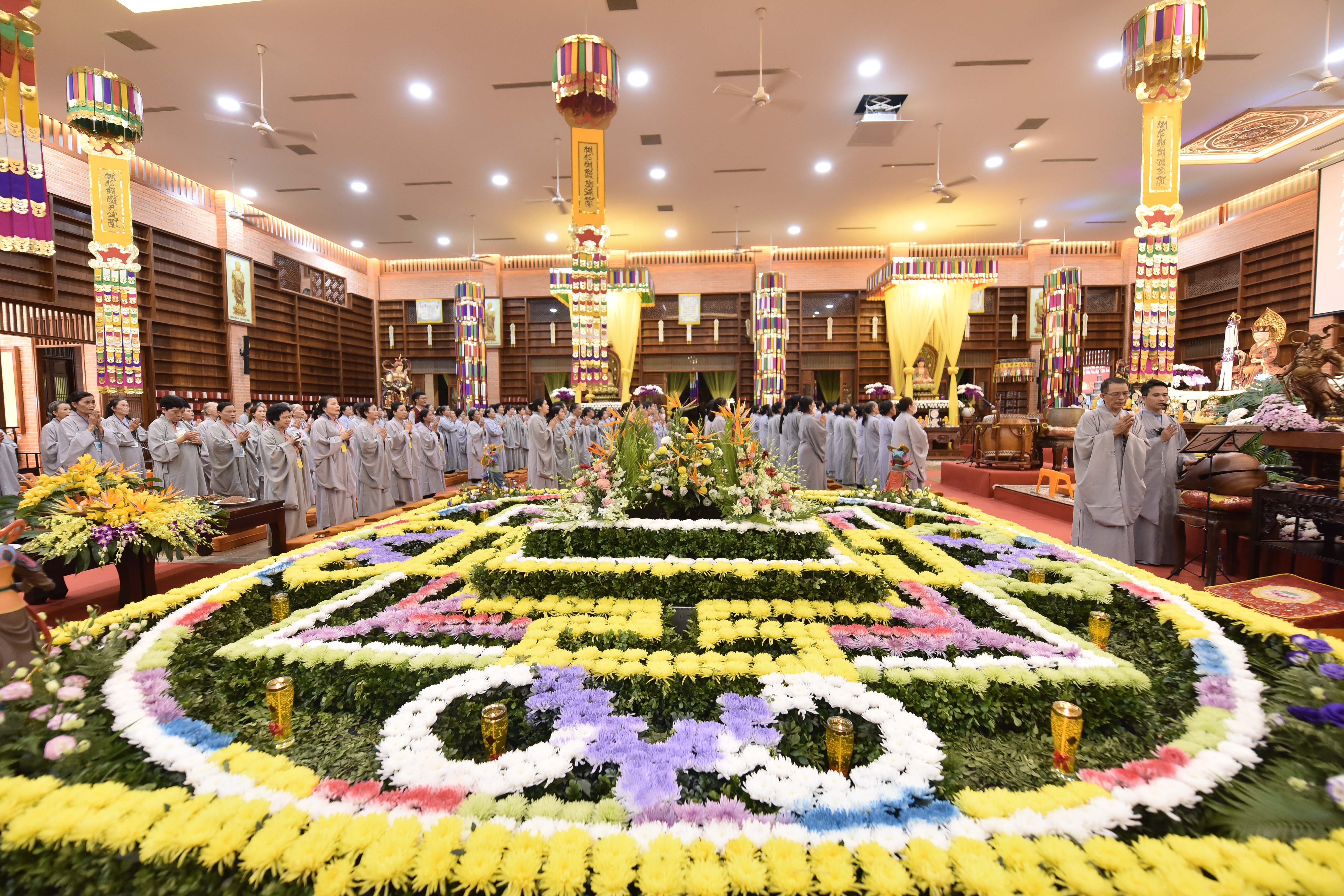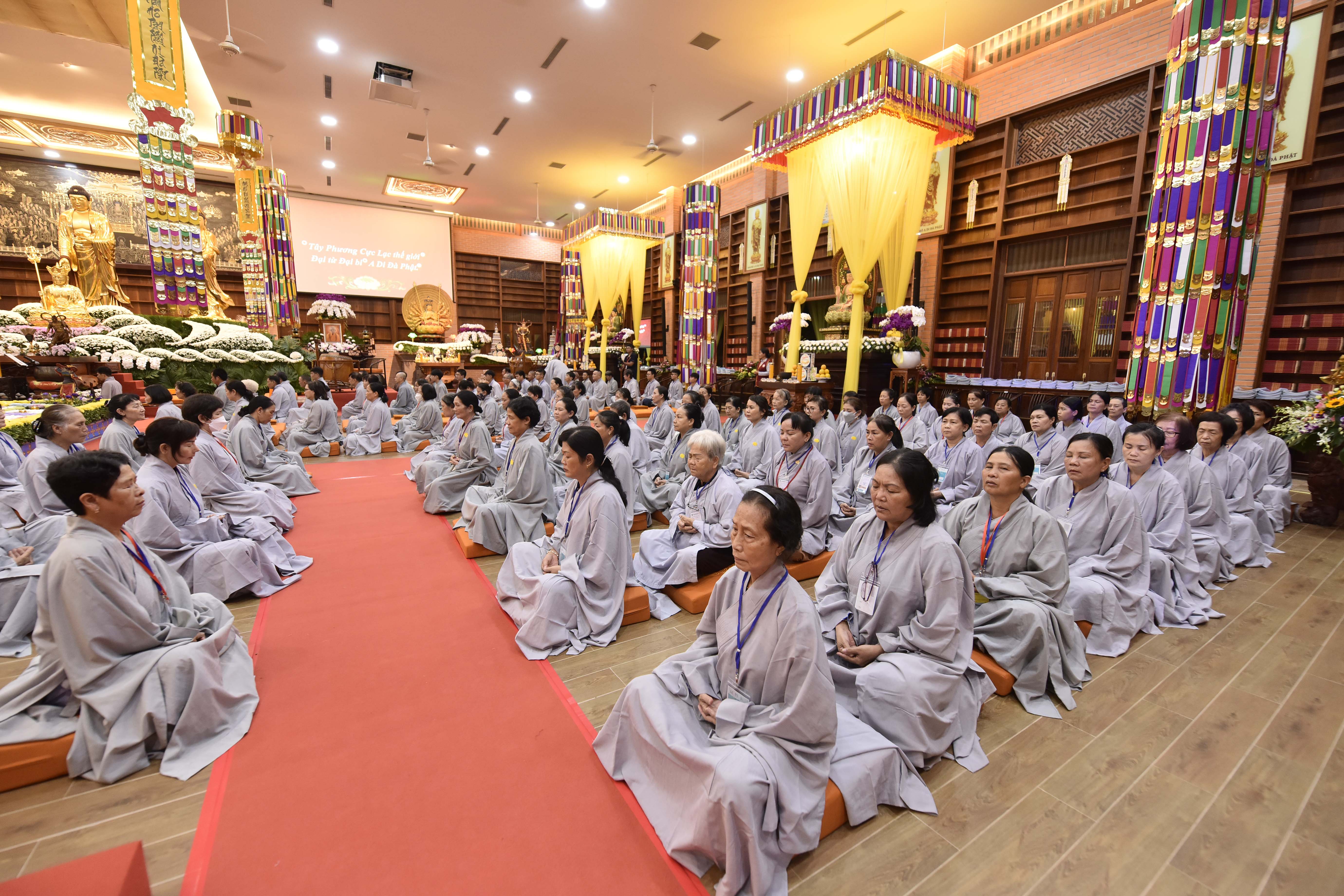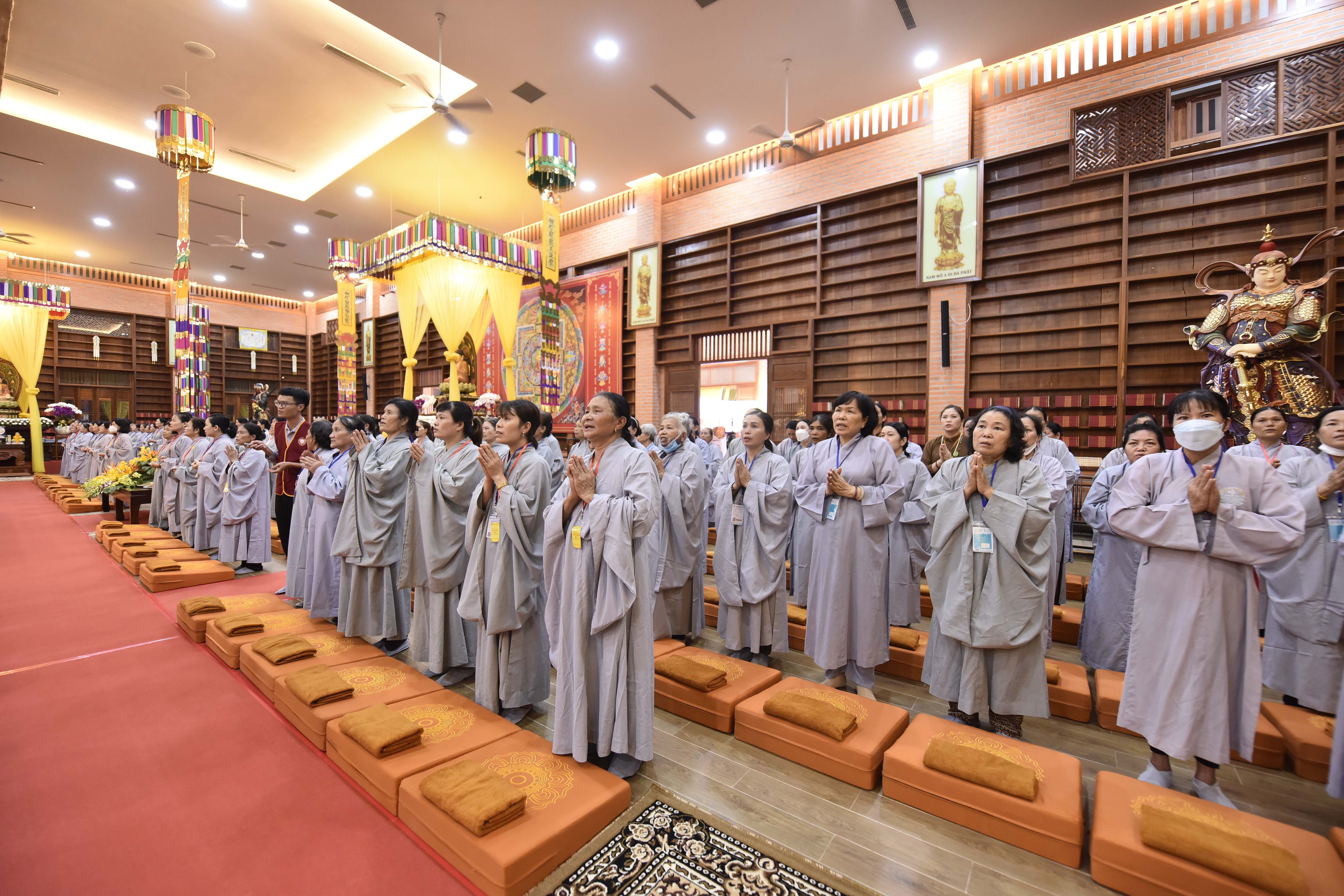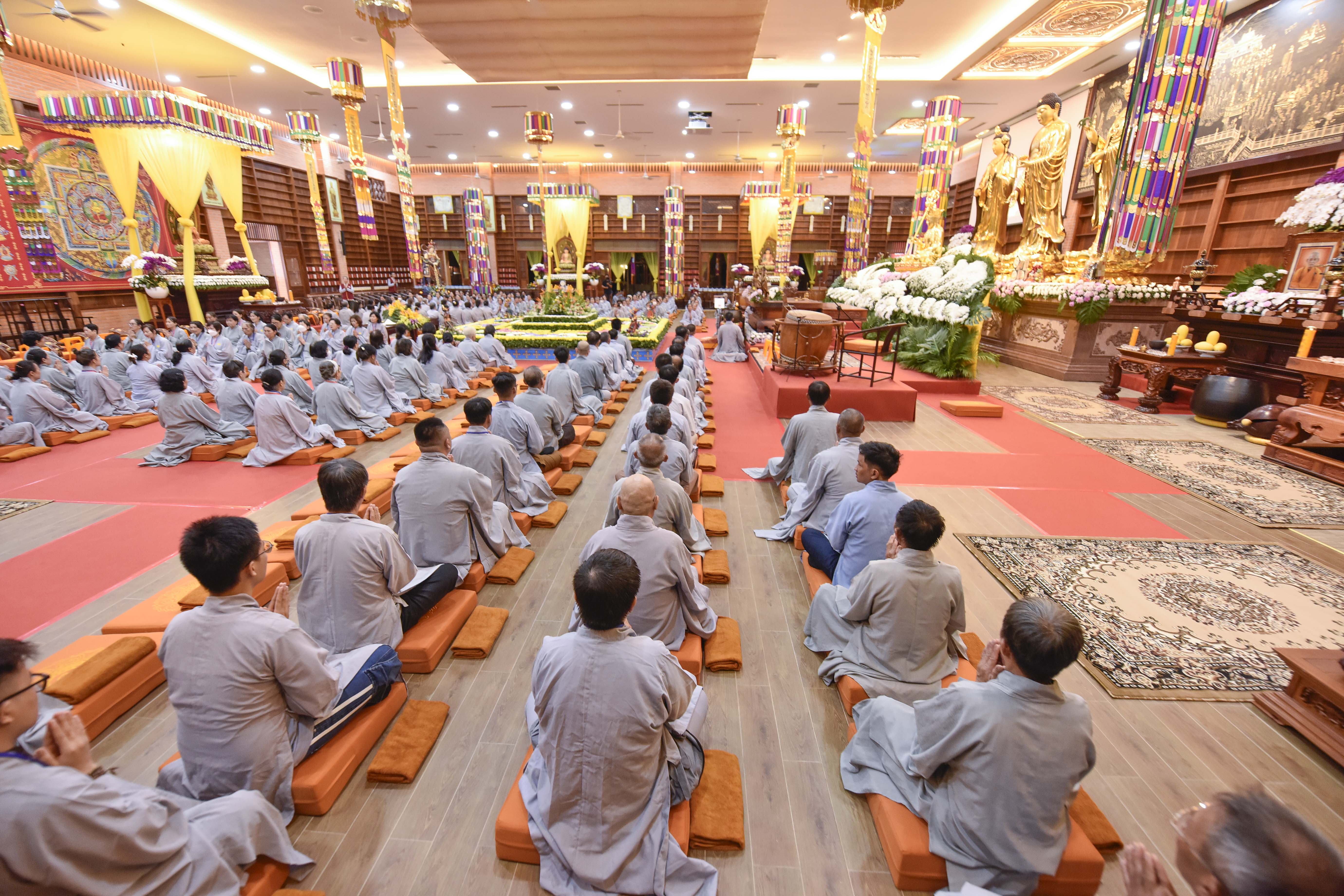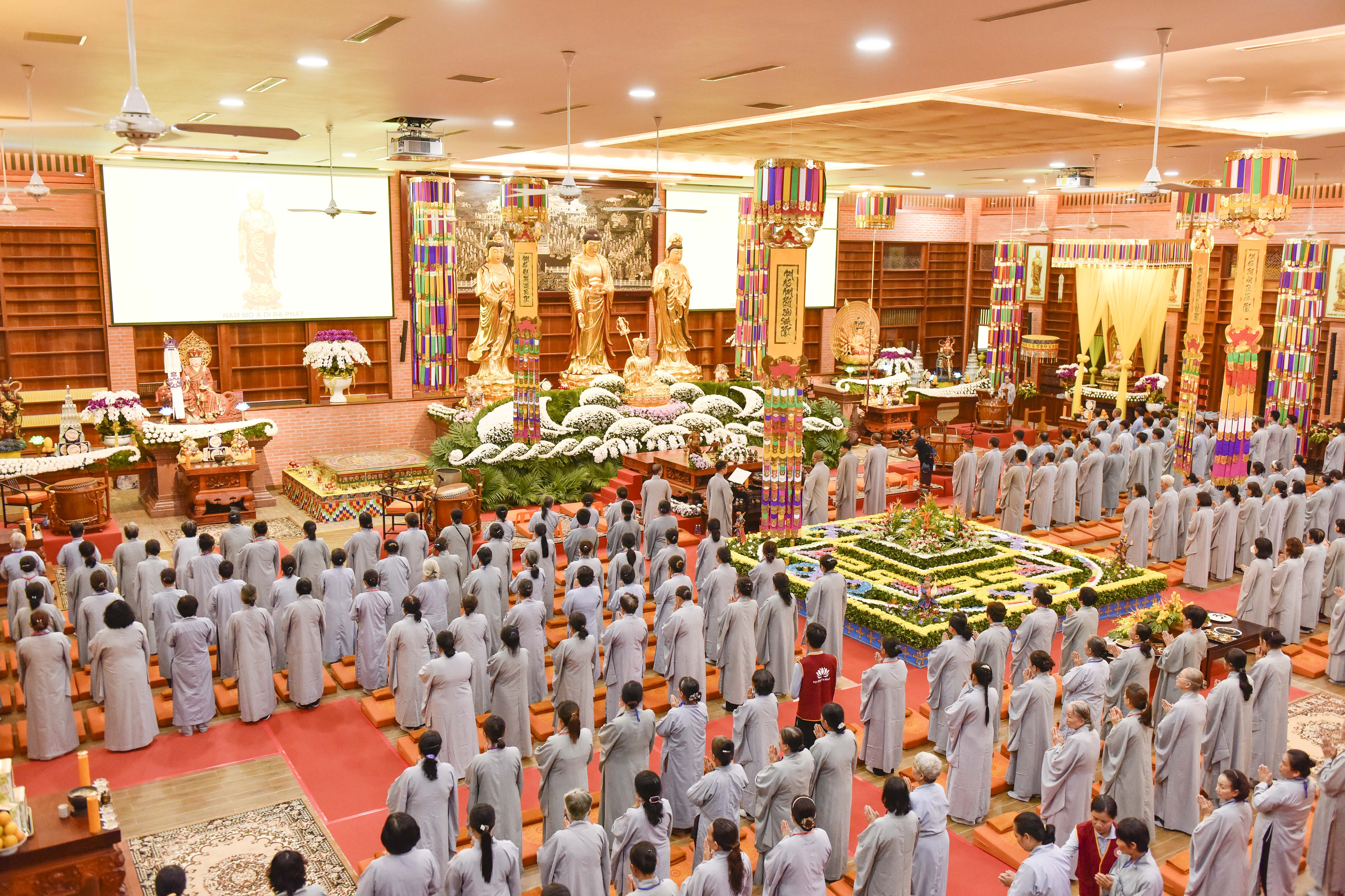 Theo đó, trước khi Pháp hội chính thức diễn ra vào ngày 25/8 (nhằm ngày 28/7 Nhâm Dần) hàng trăm Phật tử, Liên hữu đồng tu từ các đạo tràng: Bình Định, Gia Lai, Vĩnh Long, Bình Phước, Đắk Nông, Lâm Đồng, Hồ Chí Minh,… đã trang nghiêm tham gia cộng tu theo pháp môn Tịnh độ tại Niệm Phật Đường 500 vào tối ngày 24/8 (nhằm ngày 27/7 Nhâm Dần).