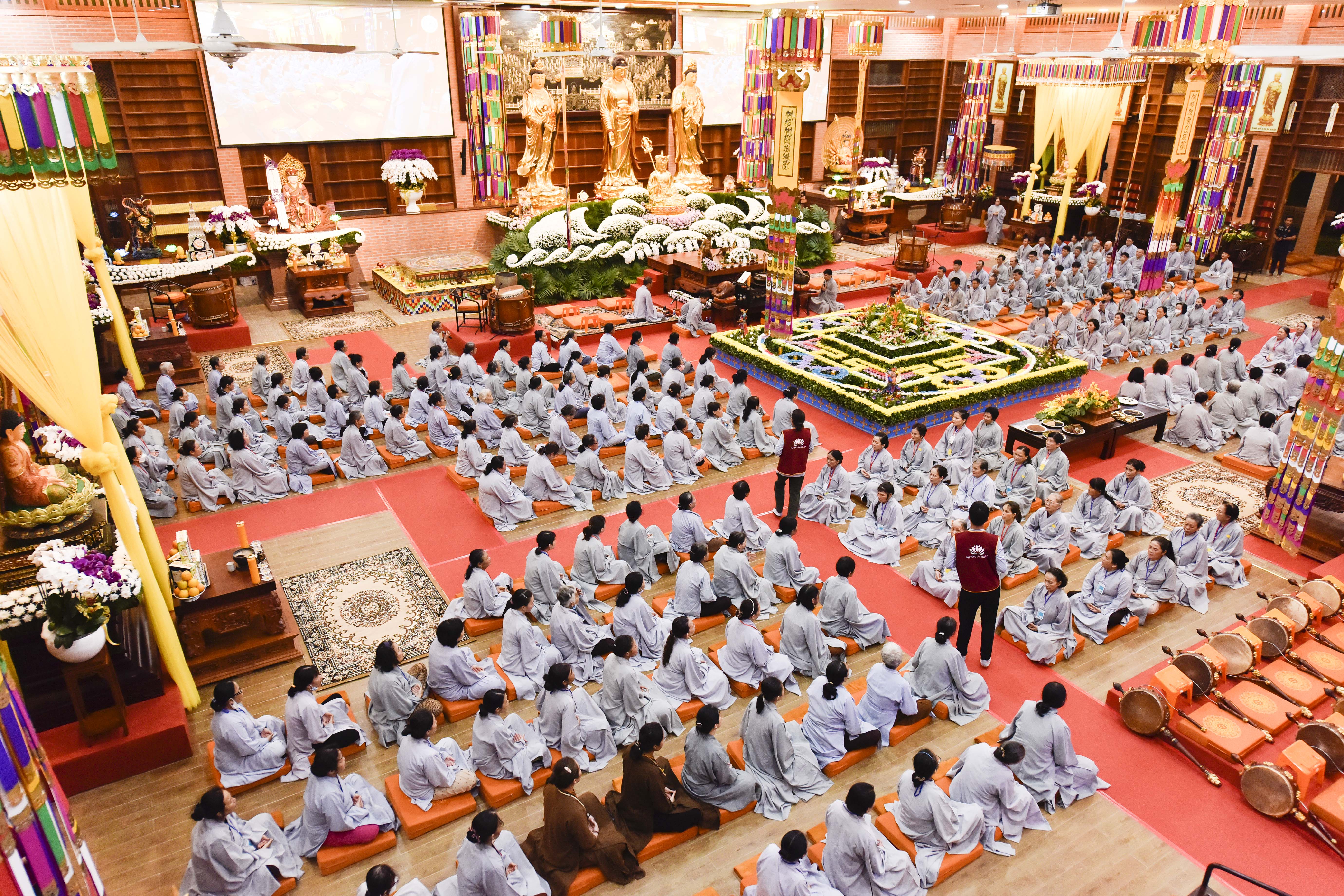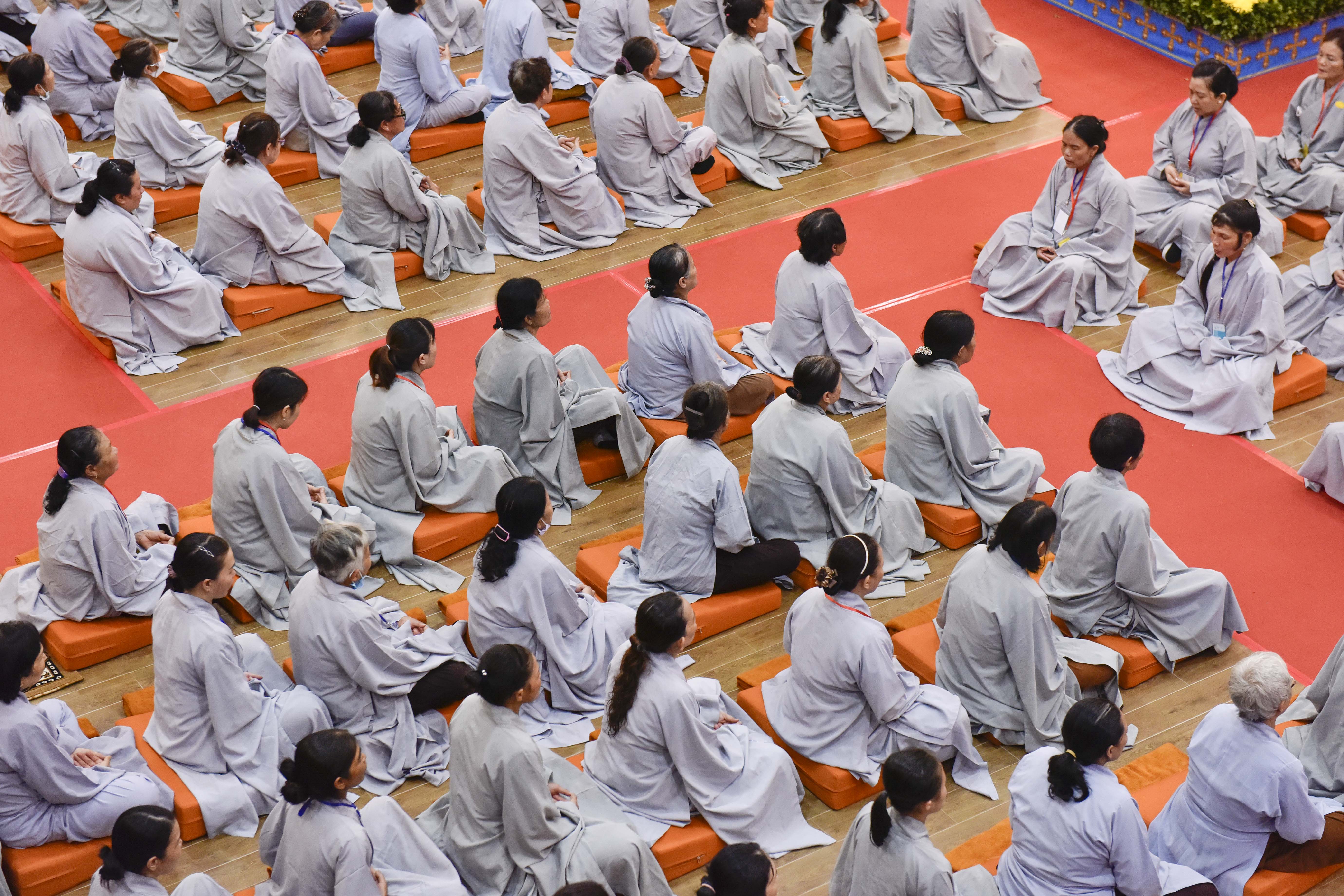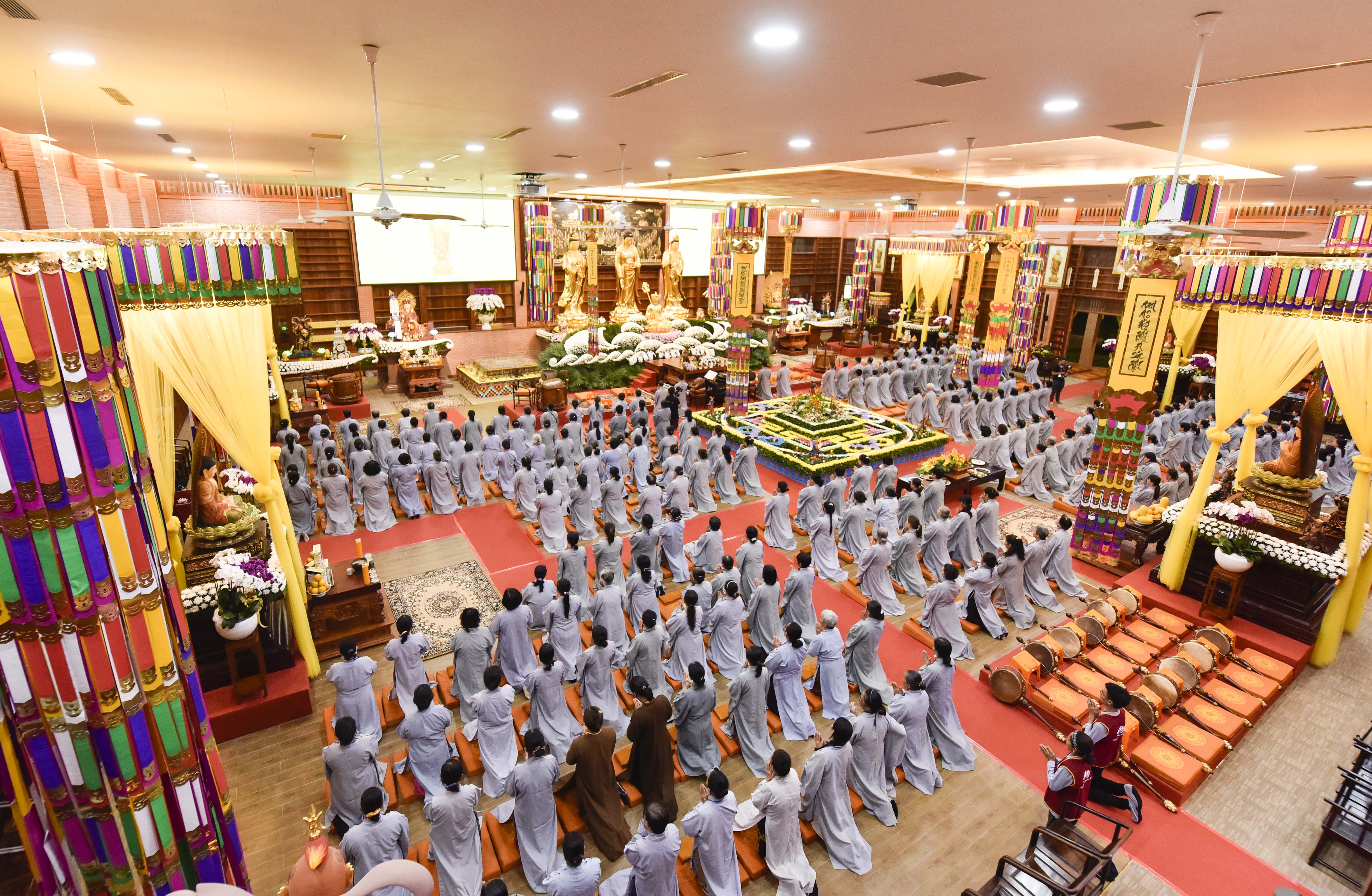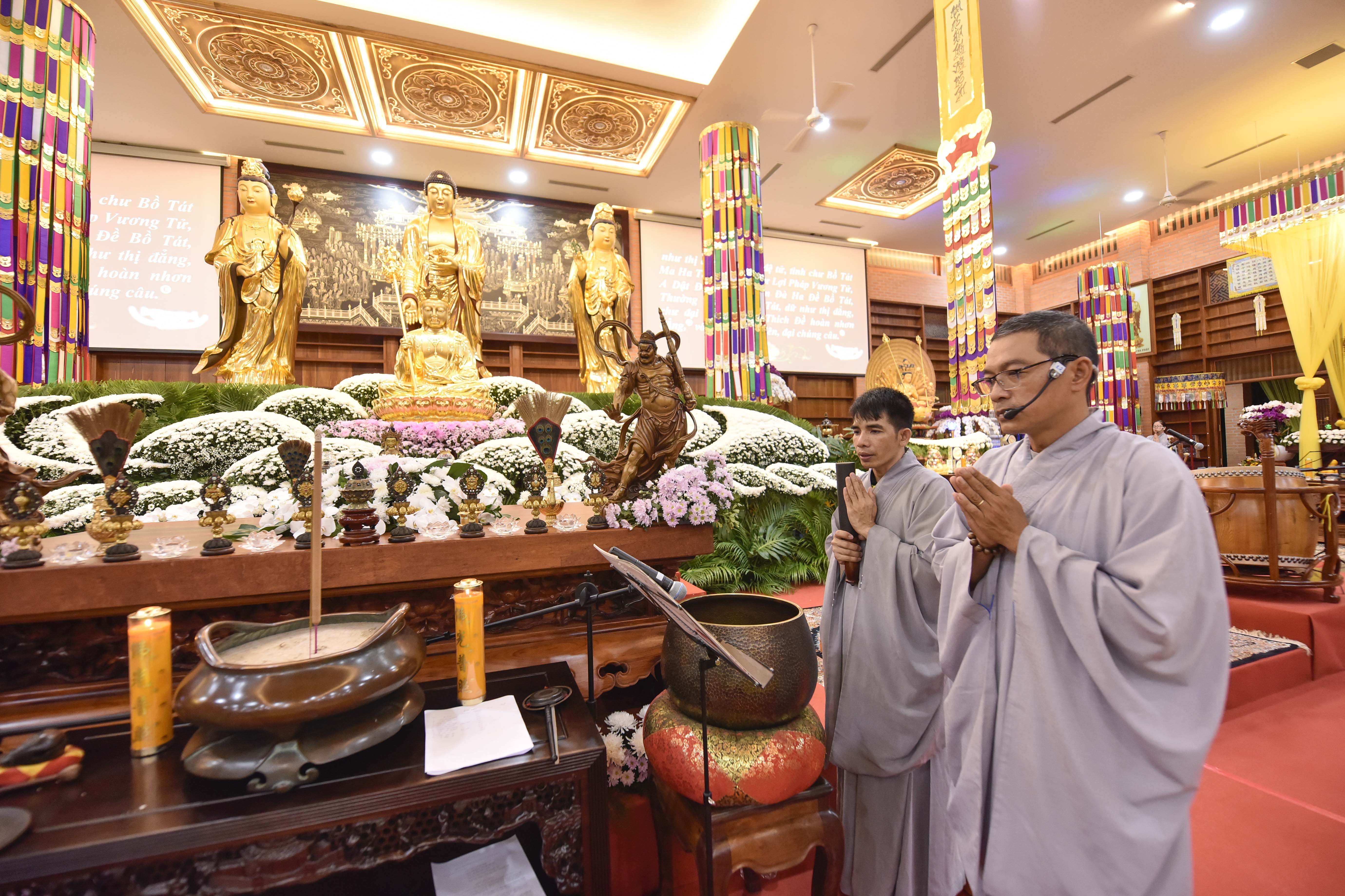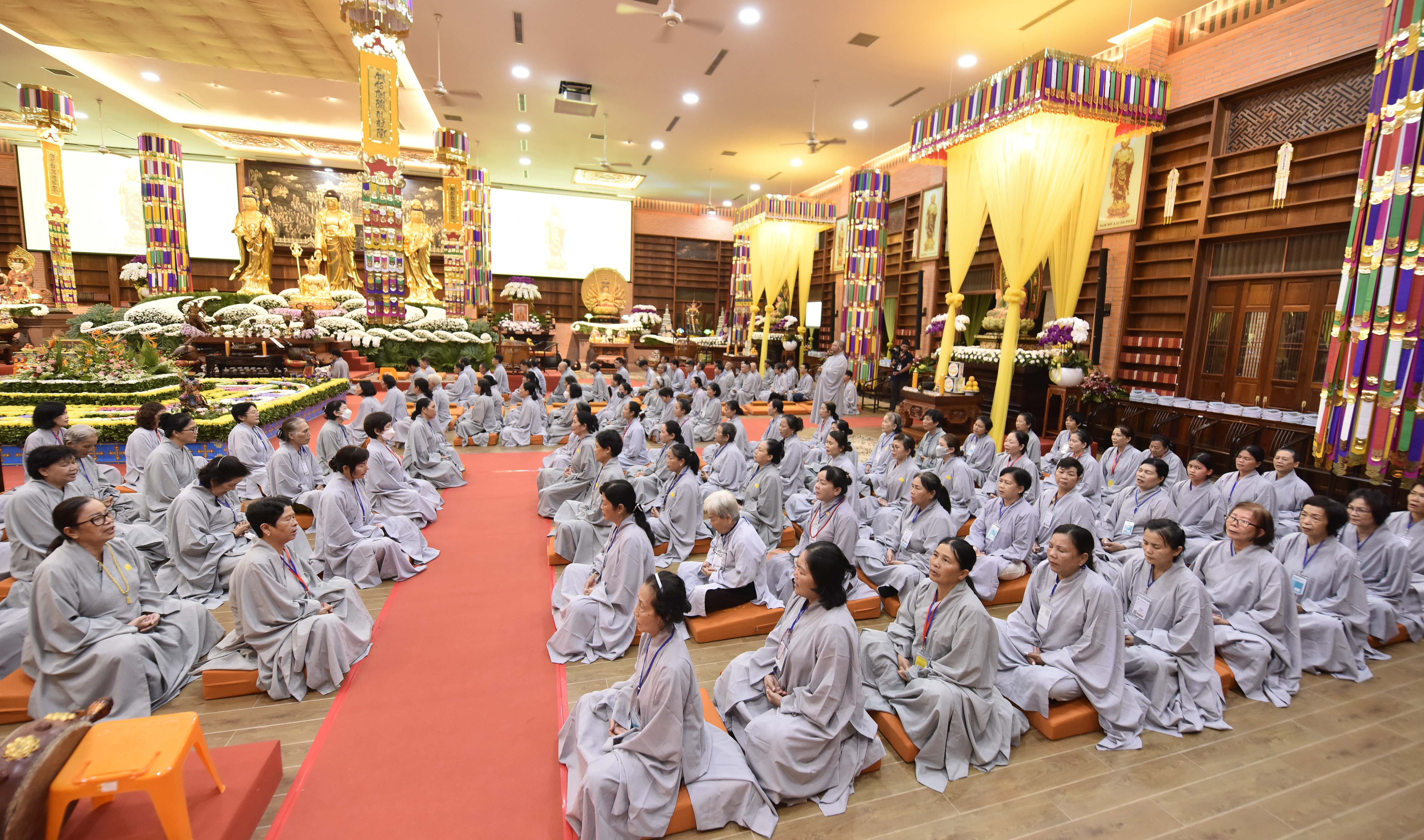 Theo đó, trước khi Pháp hội chính thức diễn ra vào ngày 25/8 (nhằm ngày 28/7 Nhâm Dần) hàng trăm Phật tử, Liên hữu đồng tu từ các đạo tràng: Bình Định, Gia Lai, Vĩnh Long, Bình Phước, Đắk Nông, Lâm Đồng, Hồ Chí Minh,… đã trang nghiêm tham gia cộng tu theo pháp môn Tịnh độ tại Niệm Phật Đường 500 vào tối ngày 24/8 (nhằm ngày 27/7 Nhâm Dần).