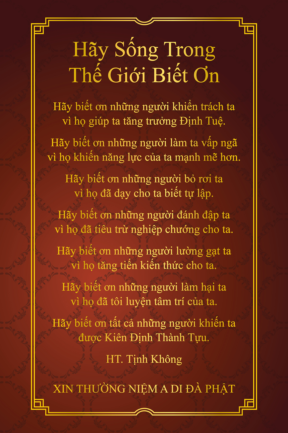 Hãy một lần quay đầu nhìn lại để bày tỏ lòng biết ơn: Tứ Trọng Ân - Ân cha mẹ, Ân Tam Bảo - Ân Thầy Cô - Ân Tổ quốc, biết ơn những người đã giúp đỡ ta trong năm qua, biết ơn những khó khăn nghịch cảnh đã giúp ta hoàn thiện, biết ơn vạn vật… và biết ơn nhiều hơn nữa, biết ơn tất cả mọi nhân duyên!