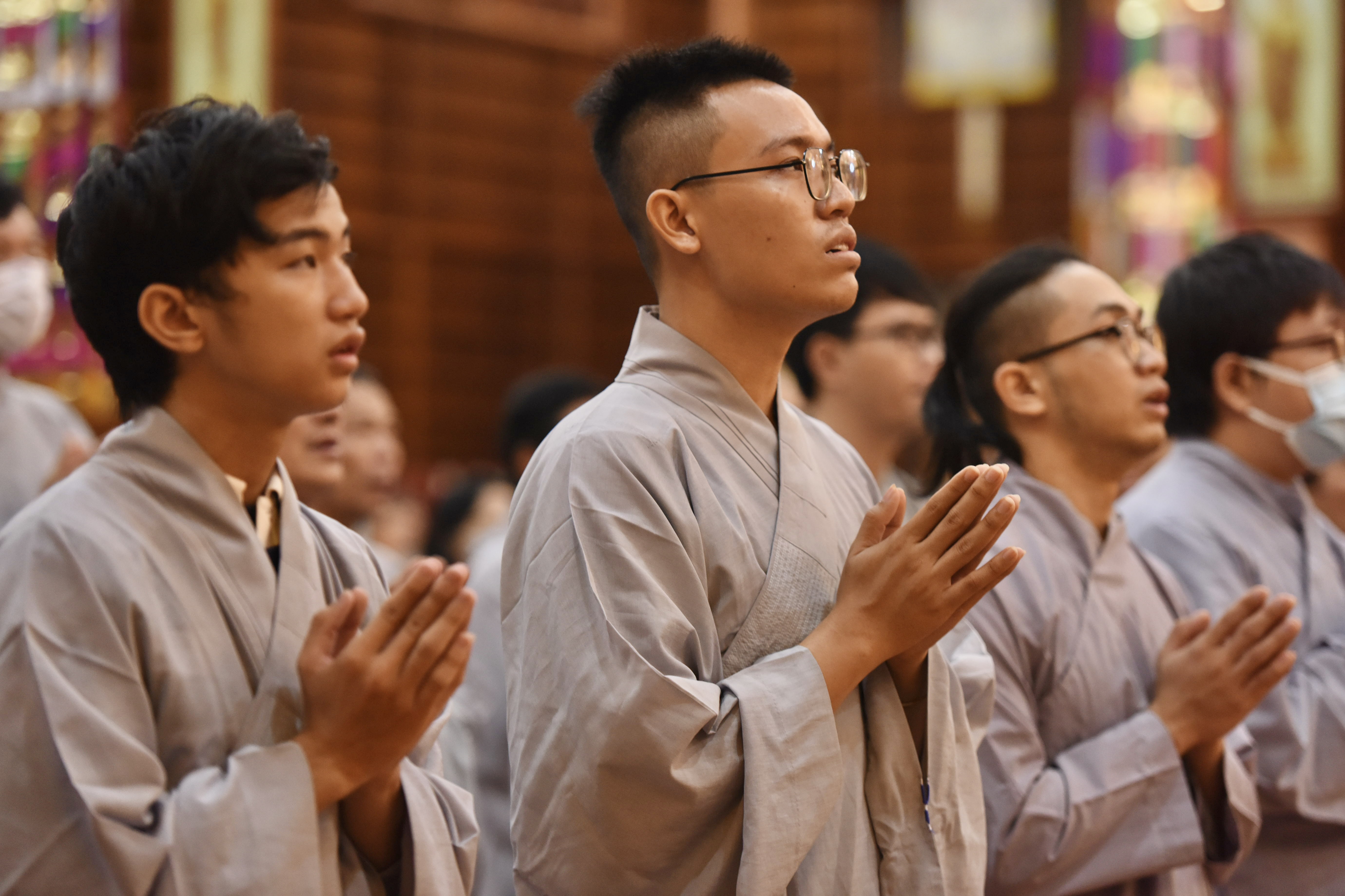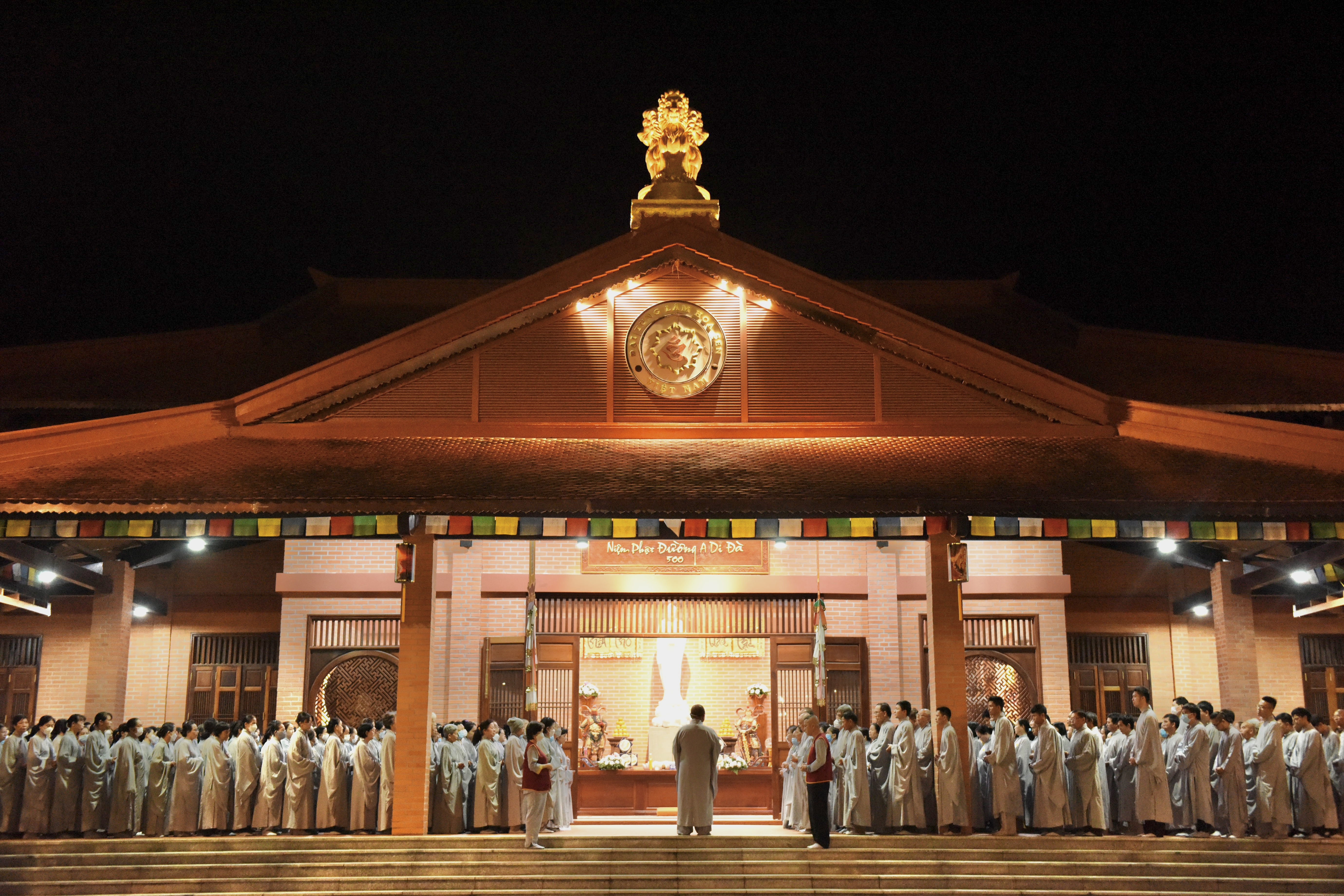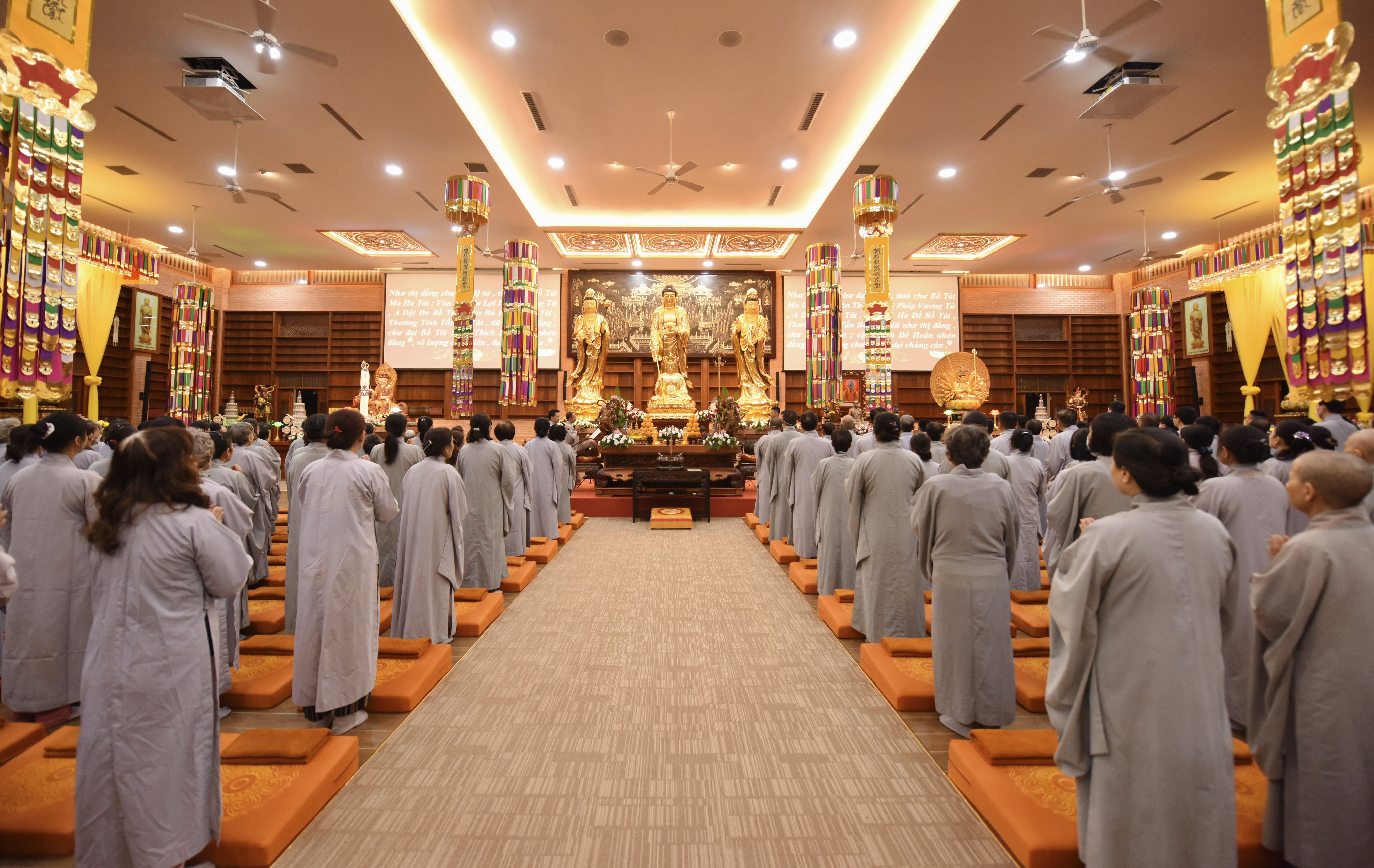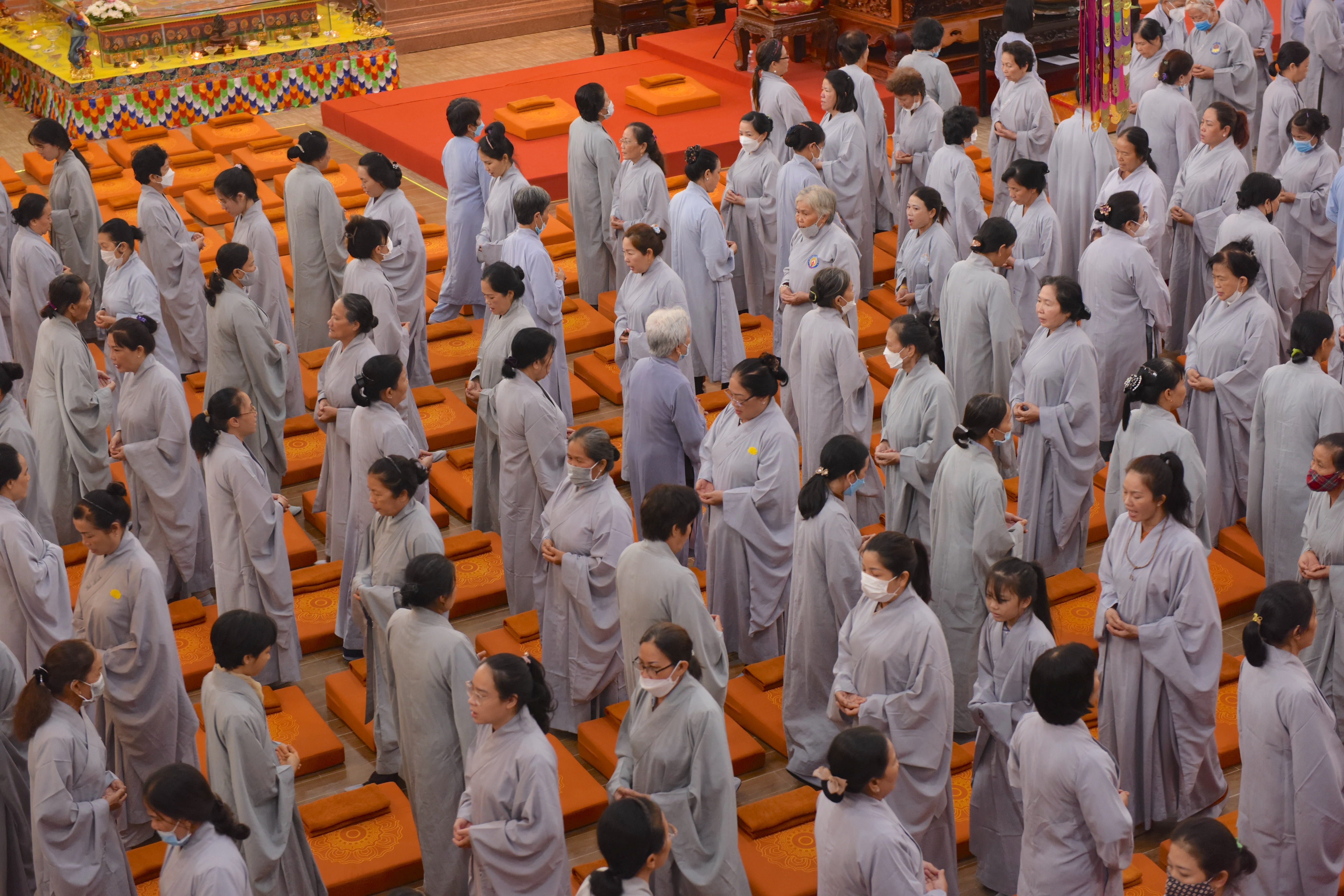 Các Phật tử vân tập trước Chánh điện - Niệm phật đường, thâu nhiếp lục căn, trang nghiêm thân tâm trước thời khoá công phu