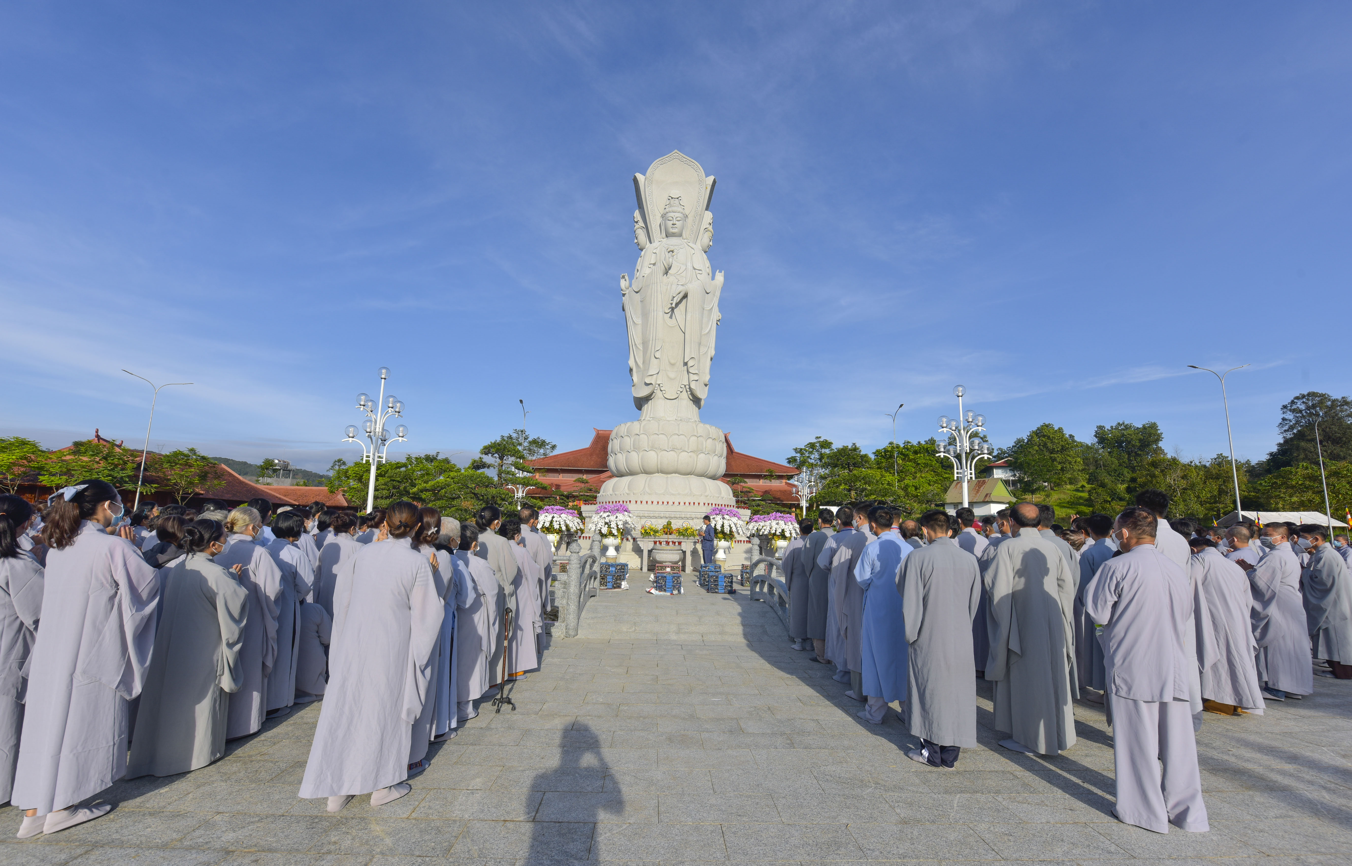 Sau thời khoá cộng tu, Phật tử cùng vân tập trước lễ đài Thánh tượng Quán Thế Âm Bồ Tát Lộ Thiên quang lâm lễ phóng sanh
