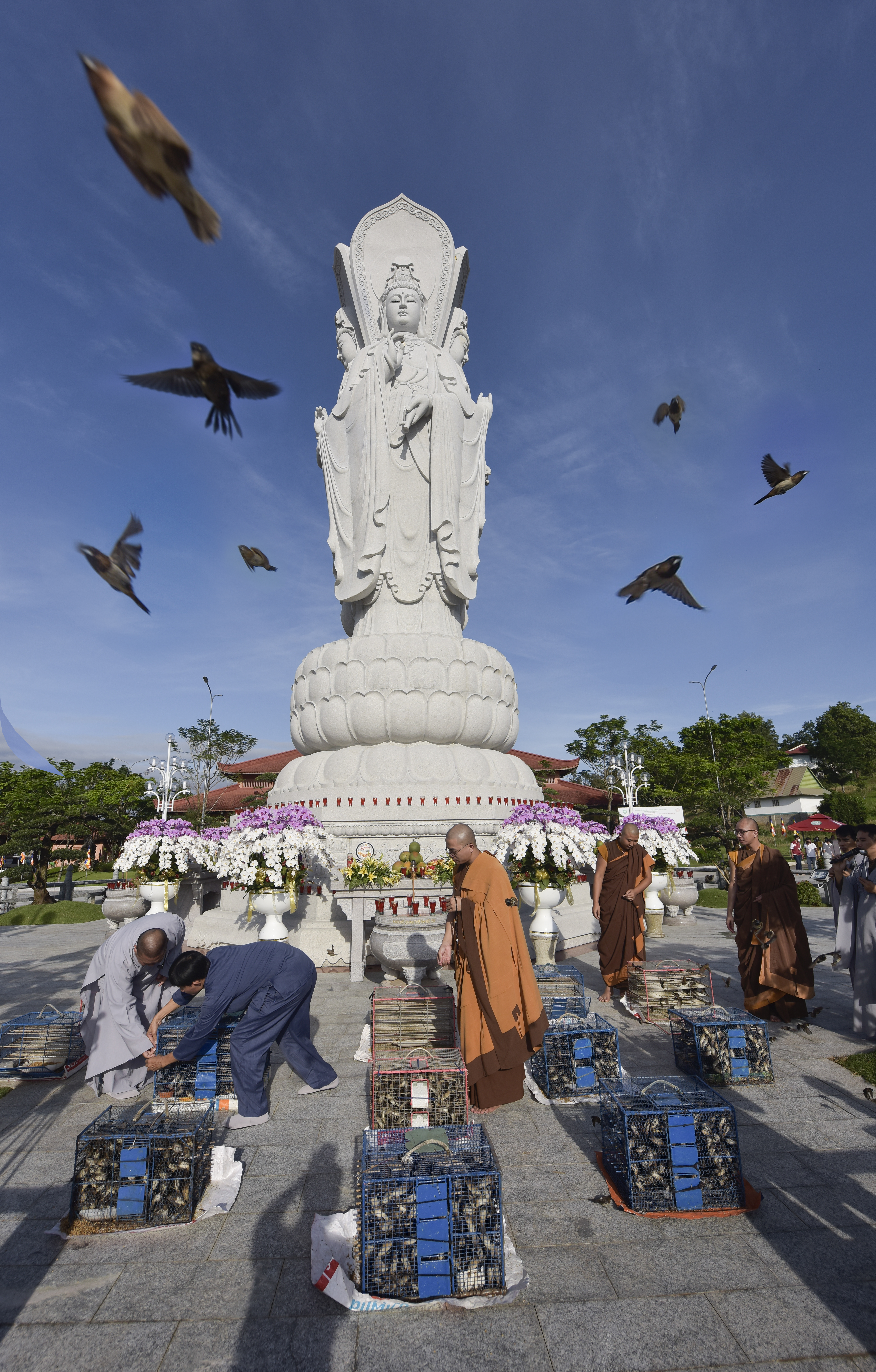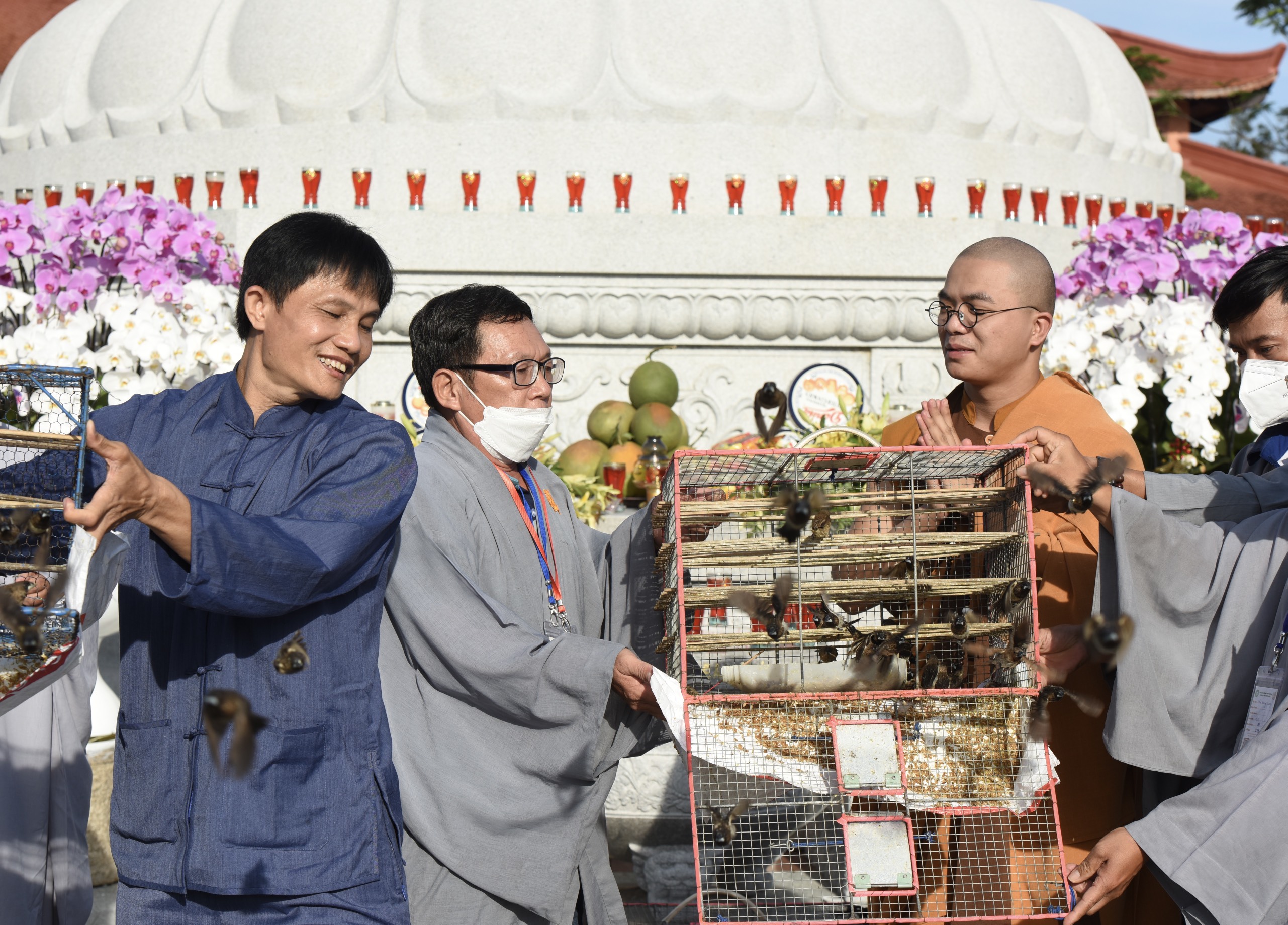 Thời khắc chiếc lồng được mở để những chú chim được trả về với tự do, niềm an vui đã lan tỏa khắp đạo tràng, trên gương mặt mỗi Phật tử là sự hoan hỷ vô biên khi đã đóng góp một chút tịnh tài trong việc giải cứu sinh mạng cho chúng sanh.