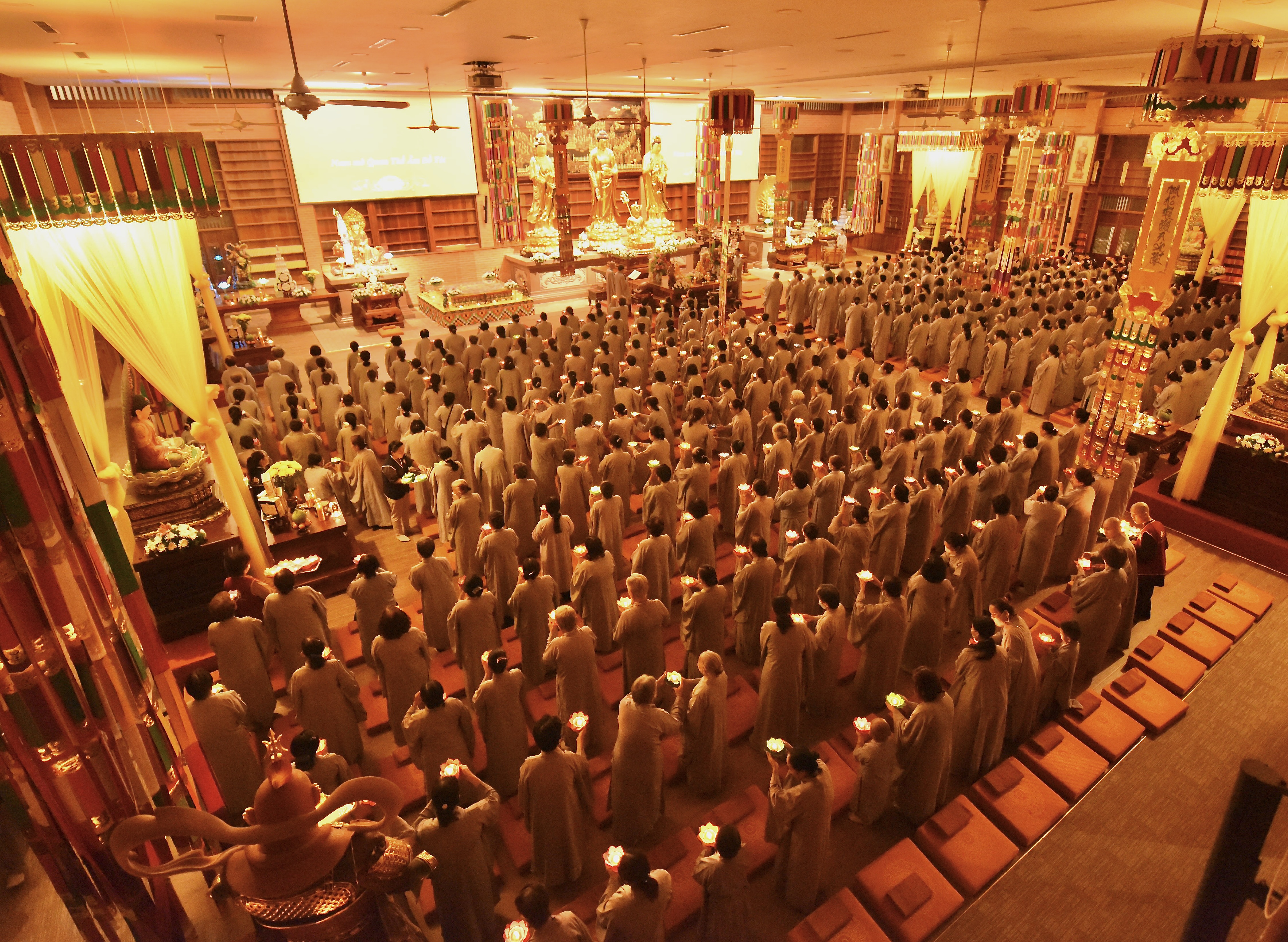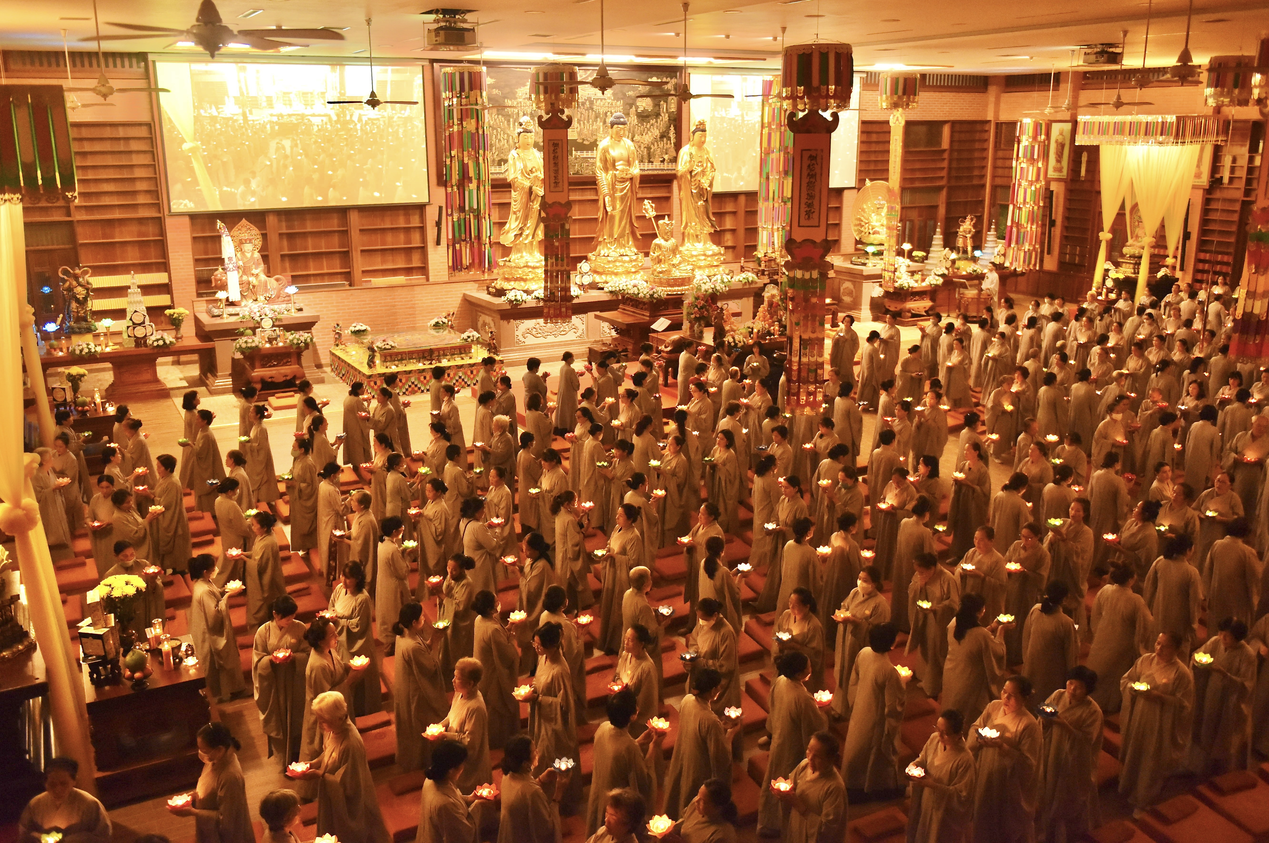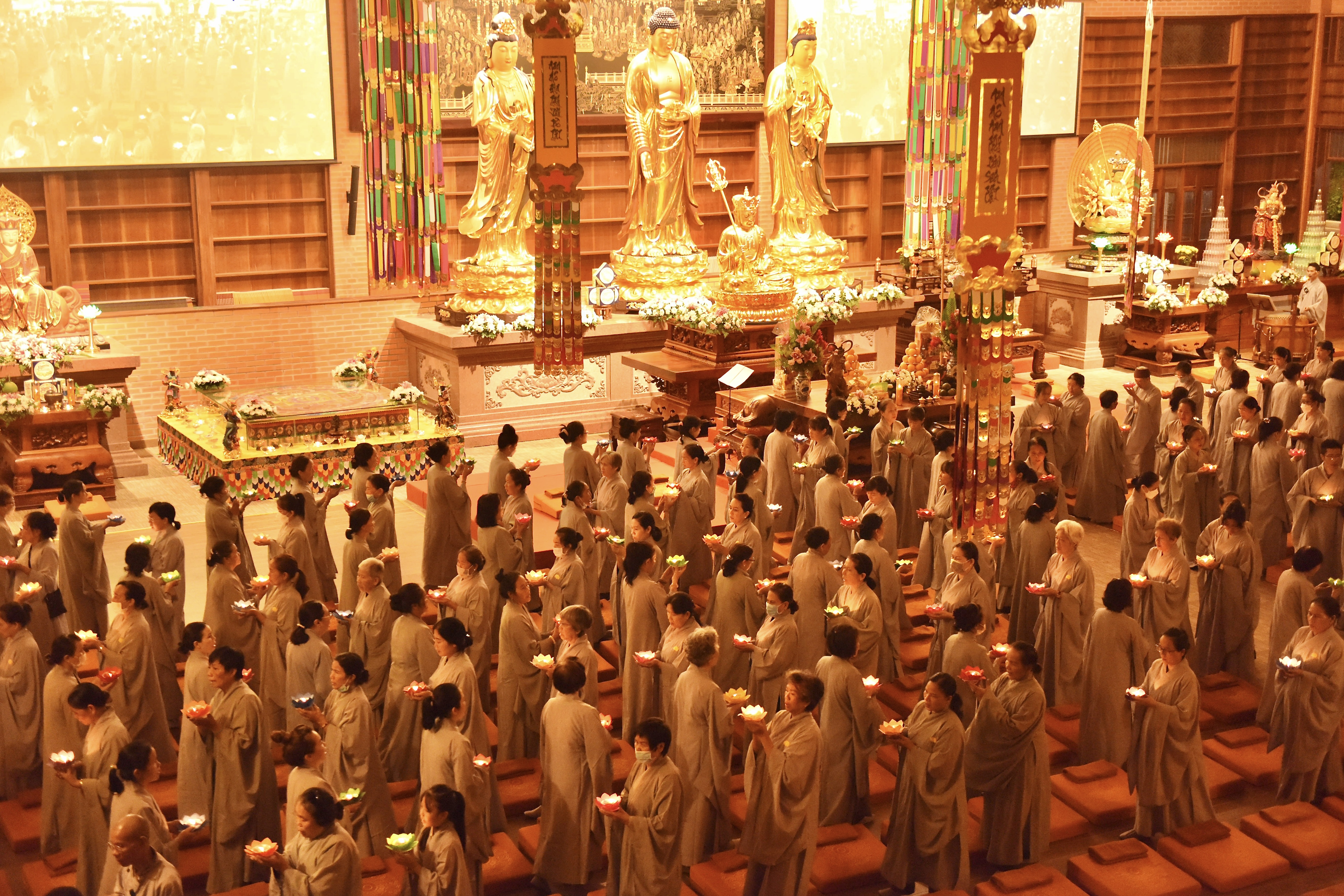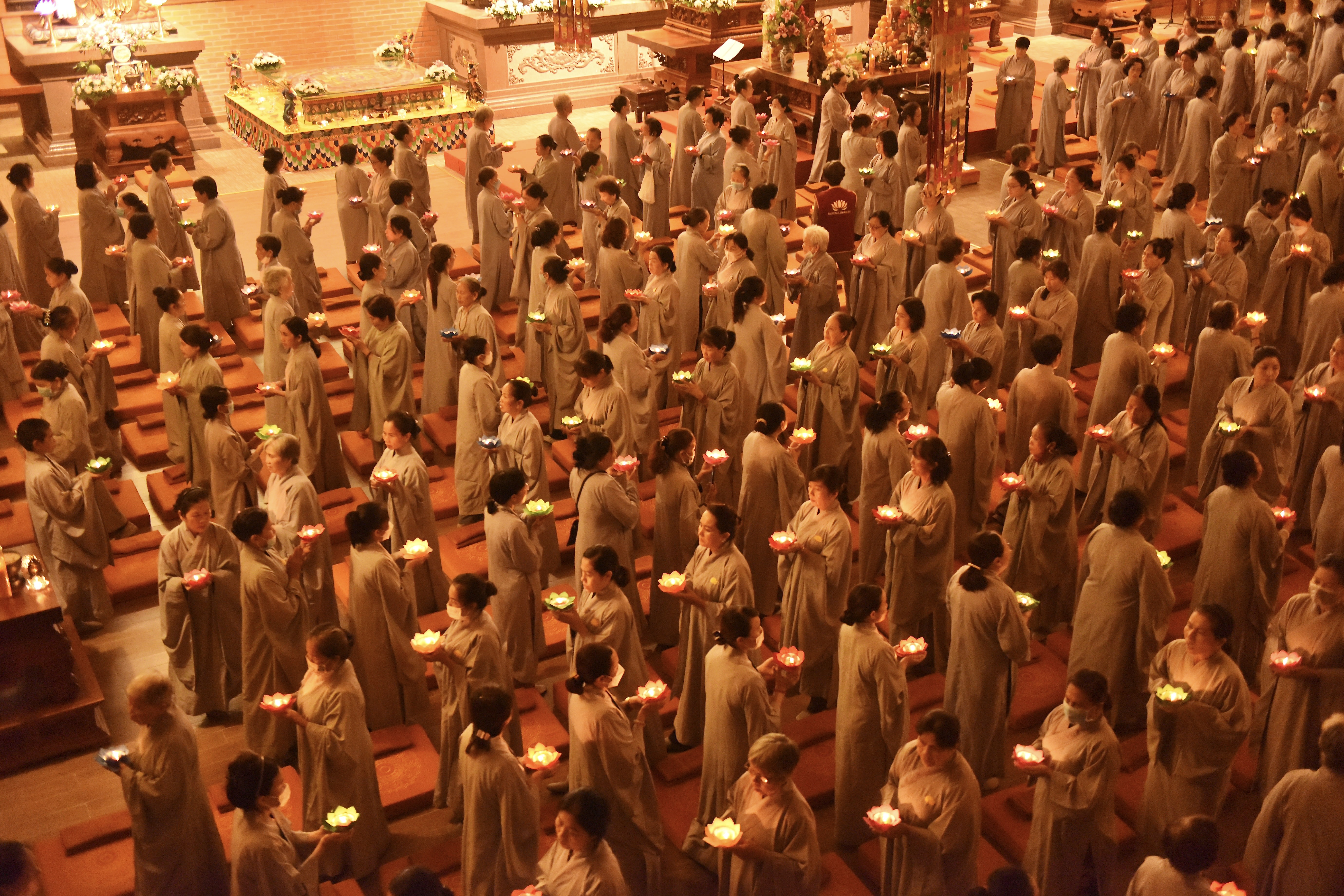 After the light transmission ceremony at the Buddha Recitation Hall, the entire congregation walked in an orderly manner to the area of the altar of the sacred statue of Bodhisattva Avalokitesvara. Everyone walked in peaceful meditation, firm and harmoniously chanting the holy name of Bodhisattva Avalokitesvara, while holding shimmering and mystical candles in their hands. The candlelight represents wisdom, while the warmth of the candle symbolizes the compassion of the revered Buddhas and Bodhisattvas, whom every Buddhist follower respects and relies upon. This light is also the brilliant radiance of faith and enlightenment, the light of Buddha's teachings shining upon each Buddhist follower.