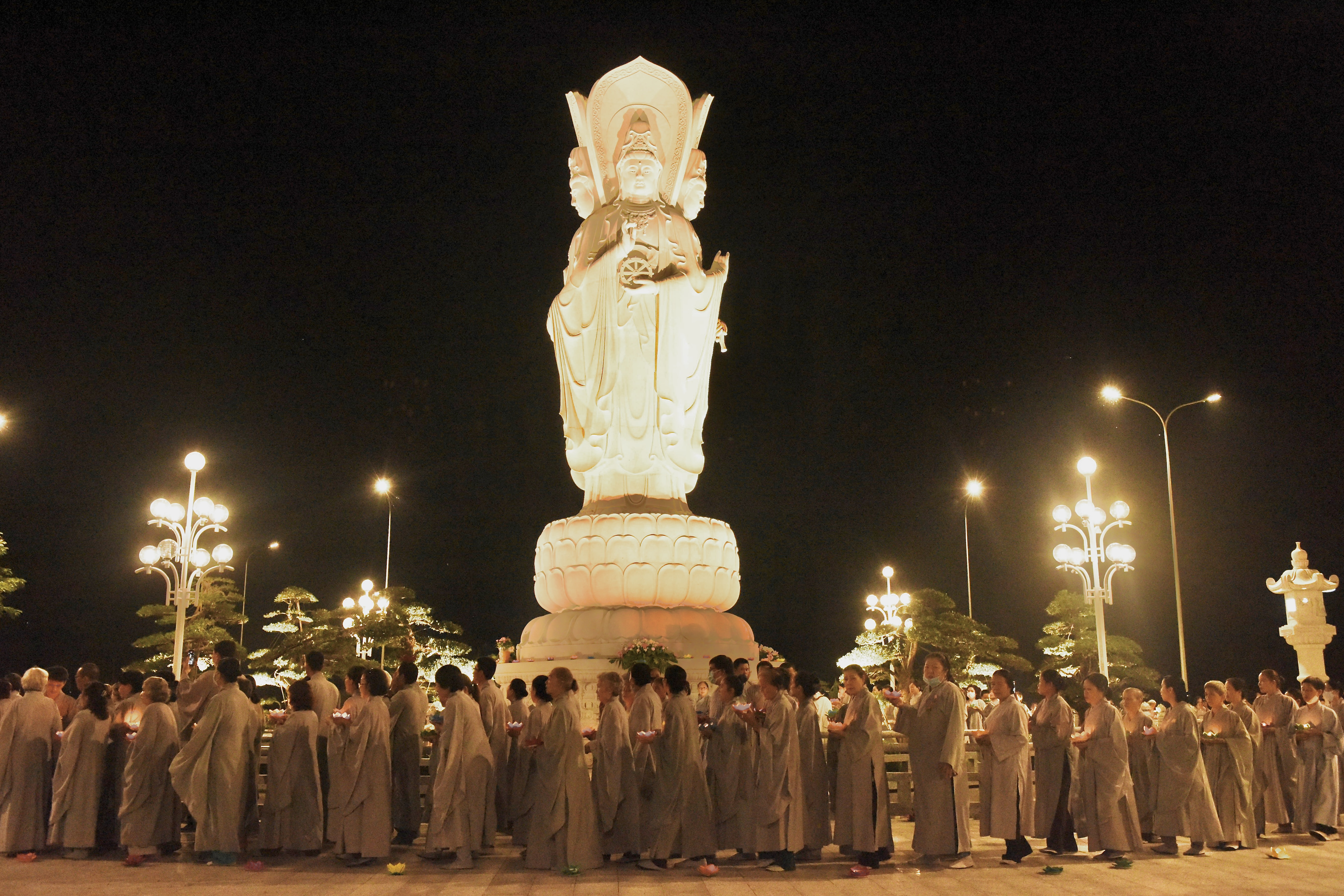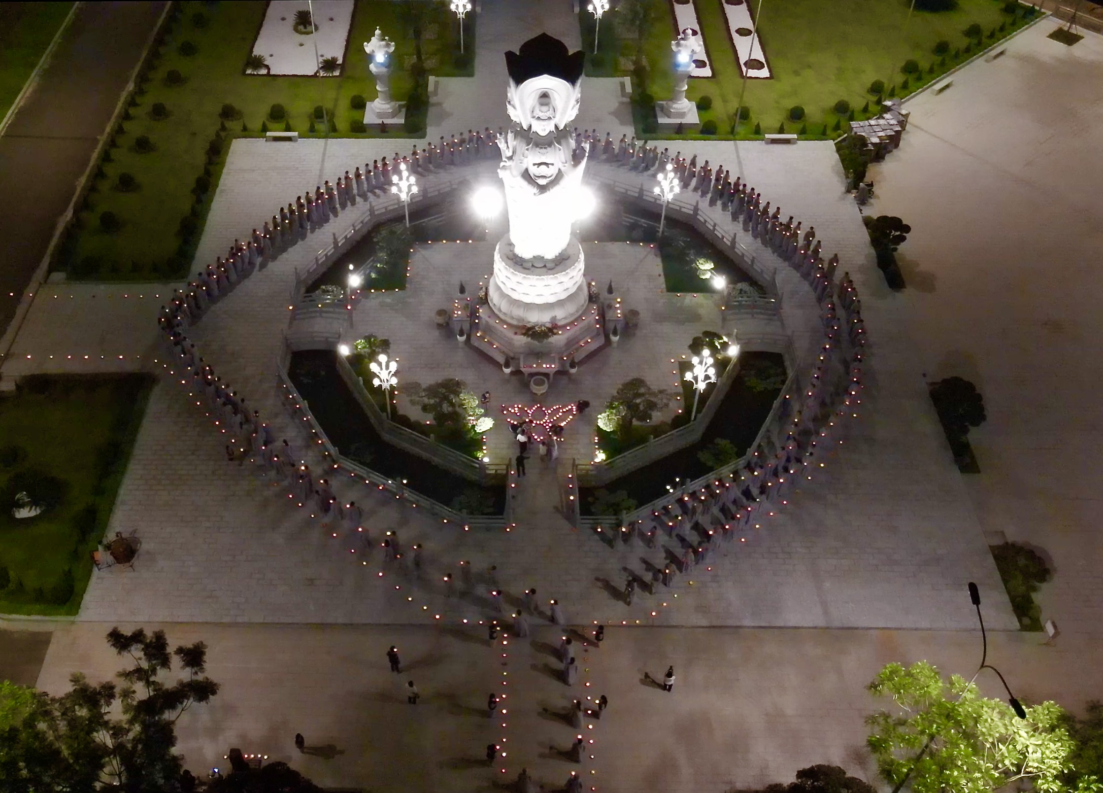 Hundreds of Buddhist followers walk together, lighting up the altar of the sacred statue of four-faced Bodhisattva Avalokitesvara