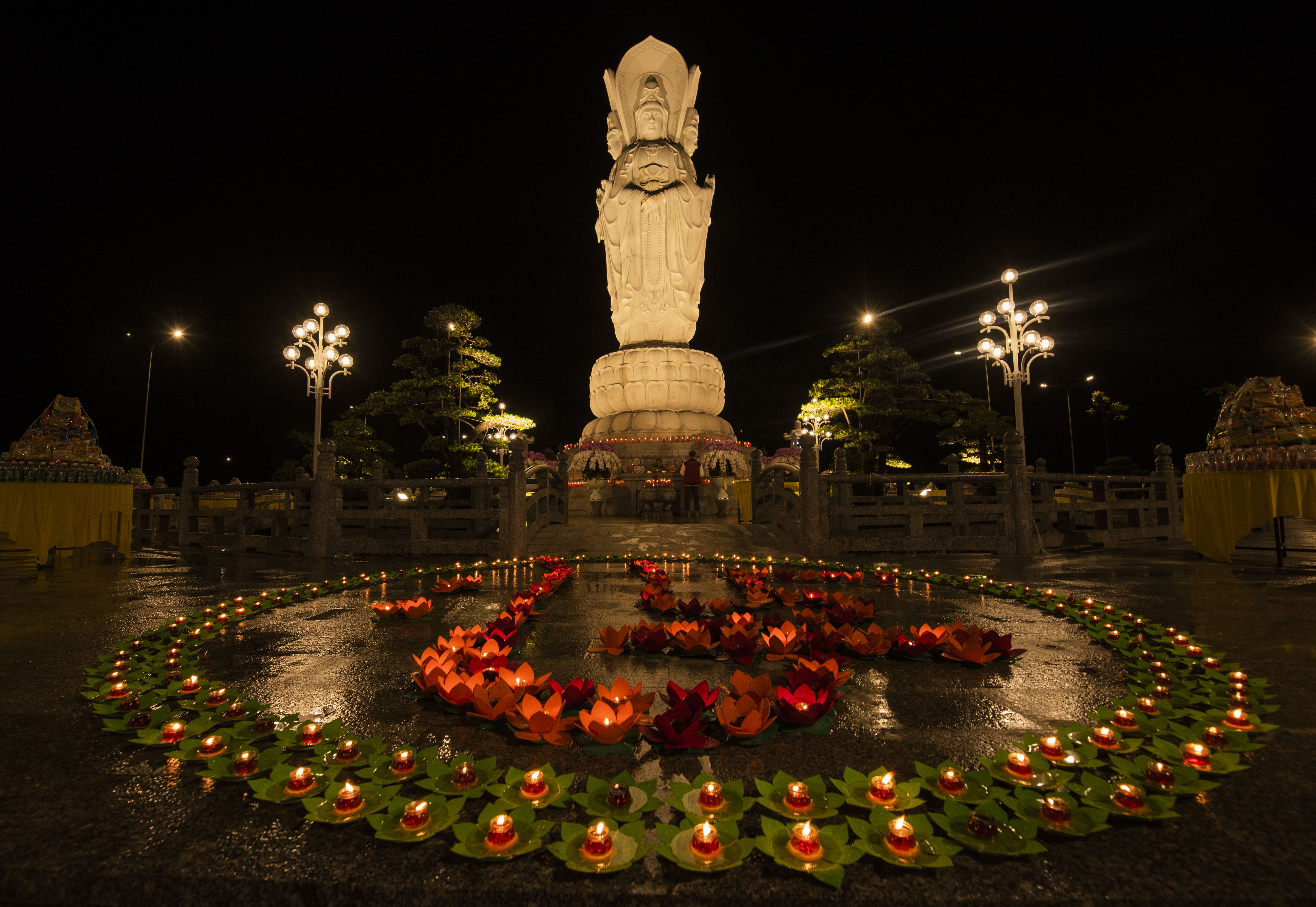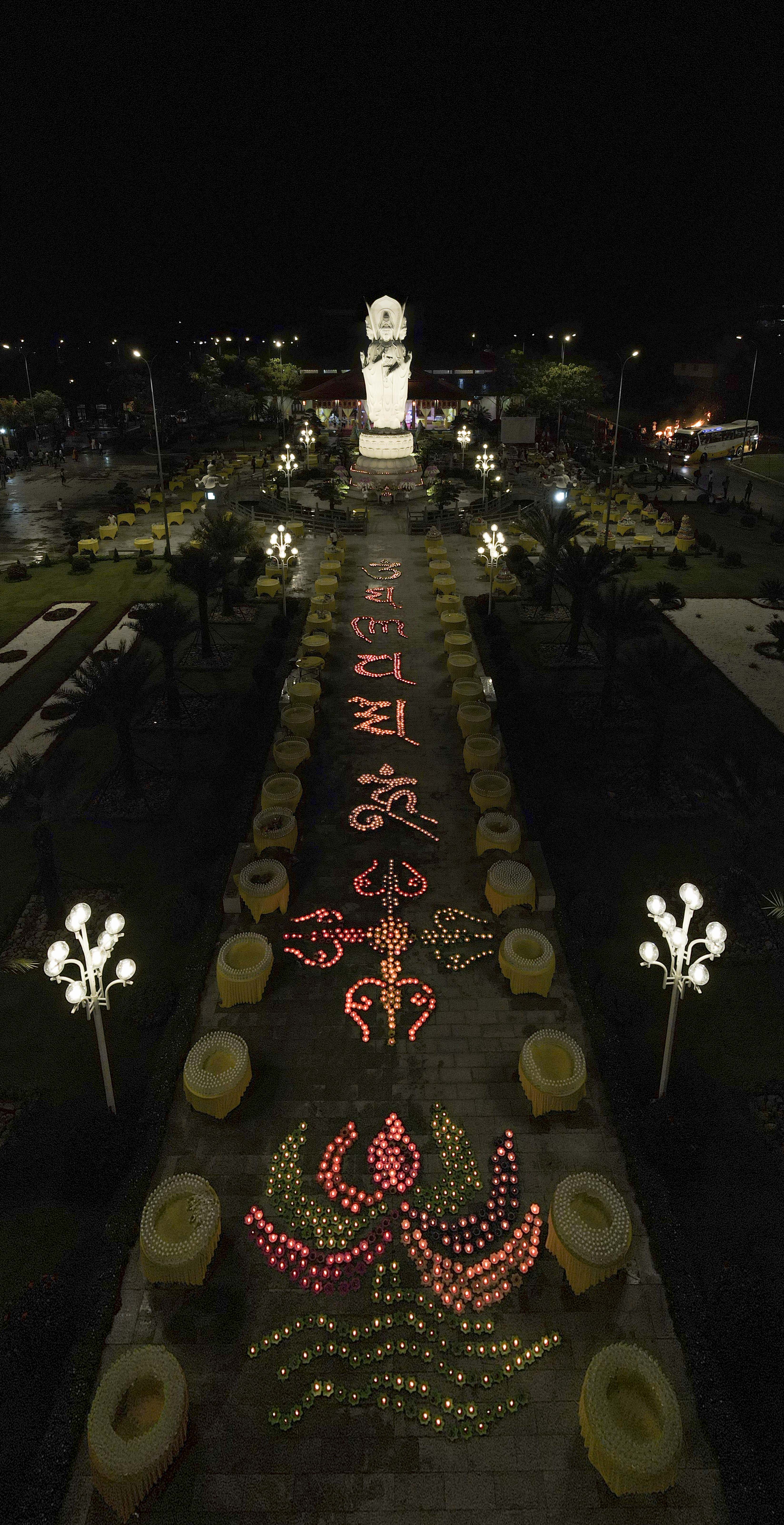 Những ngọn đèn hoa đăng tưởng niệm đồng bào đã khuất được thắp sáng trước Lễ đài Quán Thế Âm Bồ Tát Tứ Diện