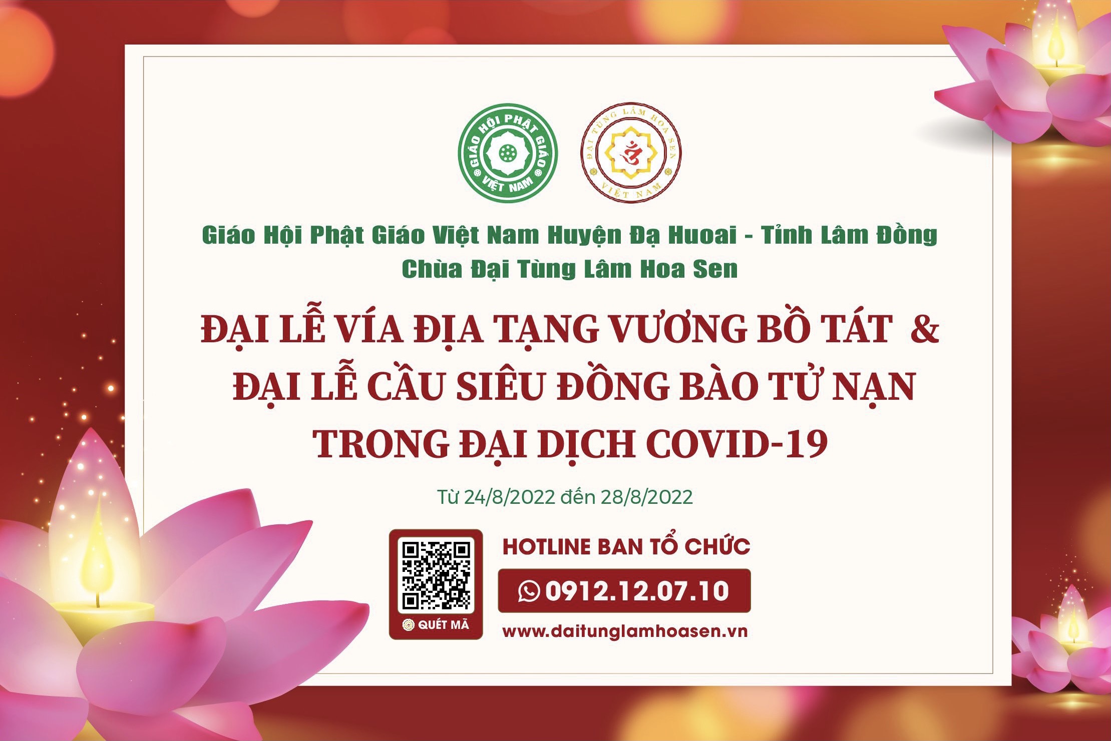 Dưới sự chủ trì của Thầy Thượng Tọa Thích Minh Thanh, trụ trì Mật Viện Thắng Nghiêm, Chùa Thắng Nghiêm, Pháp hội lần này sẽ diễn ra liên tục trong 05 ngày, từ ngày 24-25-26-27-28/8 (nhằm ngày 27-28-29/7 và ngày 01-02/8 Nhâm Dần) tại chùa Đại Tùng Lâm Hoa Sen (Quốc lộ 20, Thị trấn Đạ M’ri, Huyện Đạ Huoai, Tỉnh Lâm Đồng).