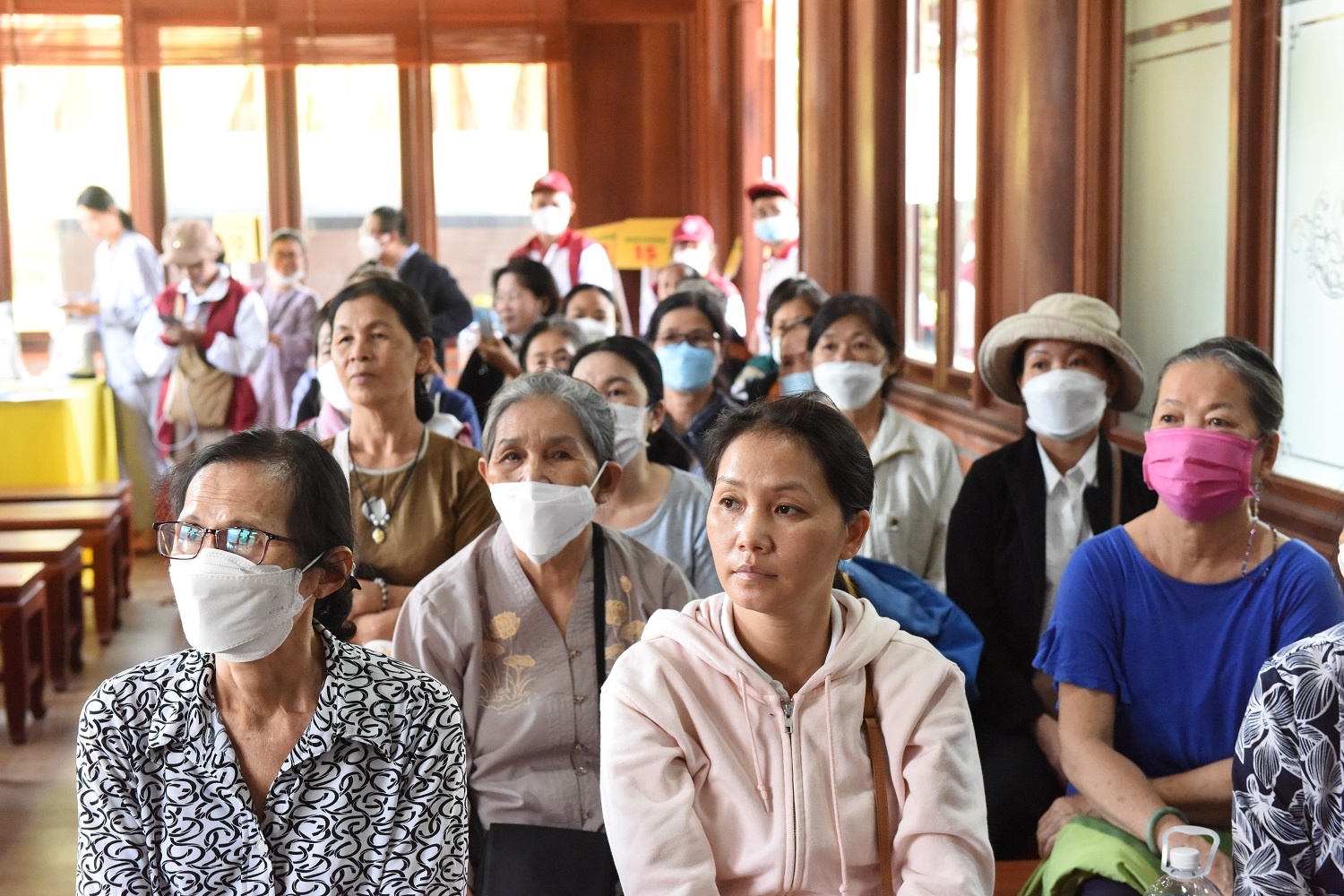 Phật tử, nhân dân chăm chú nghe Ban Liên hữu phổ biến Thanh Quy - Nội Quy khi tham dự Pháp hội tại Chùa Đại Tùng Lâm Hoa Sen