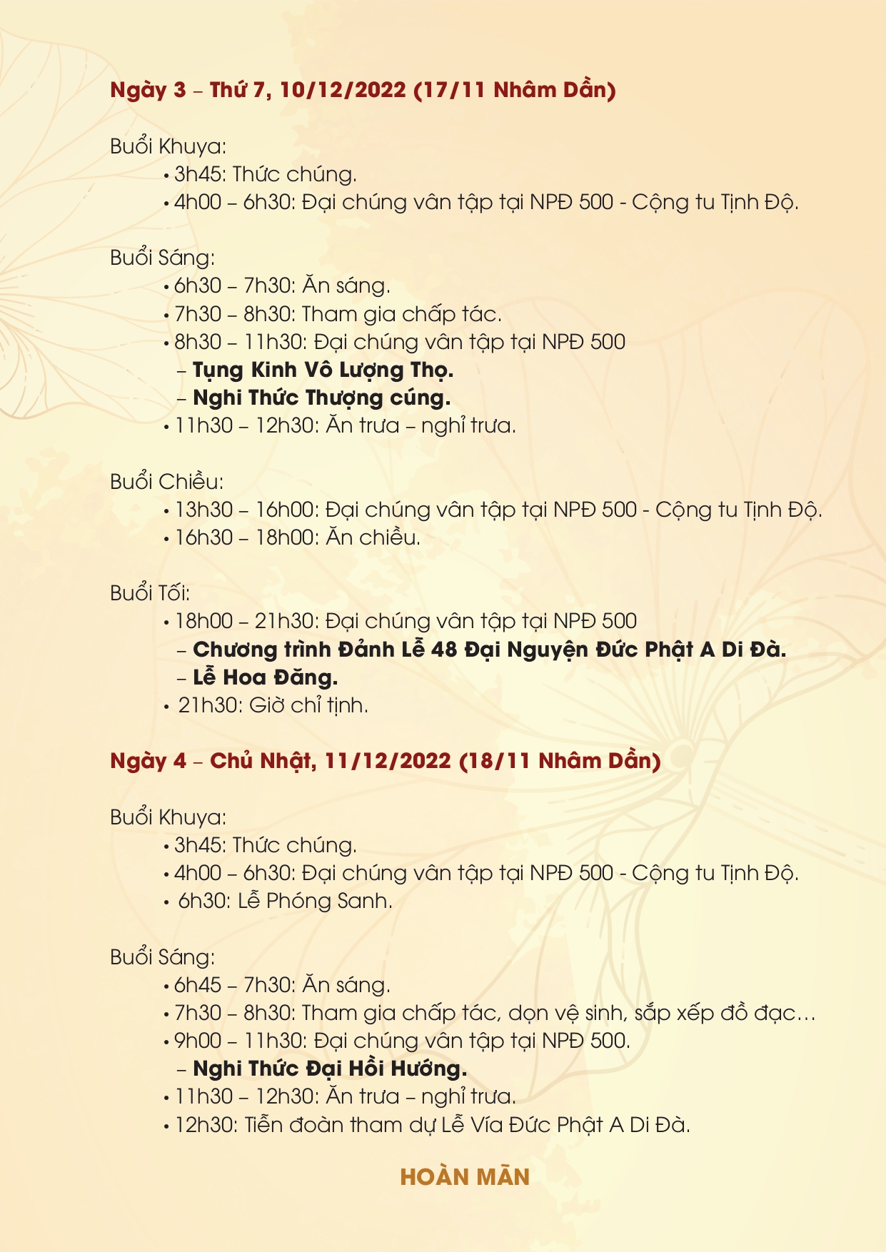 1. Thời gian tổ chức: 09/12 – 11/12/2022 (Nhằm ngày 16 – 18/11/Nhâm Dần)