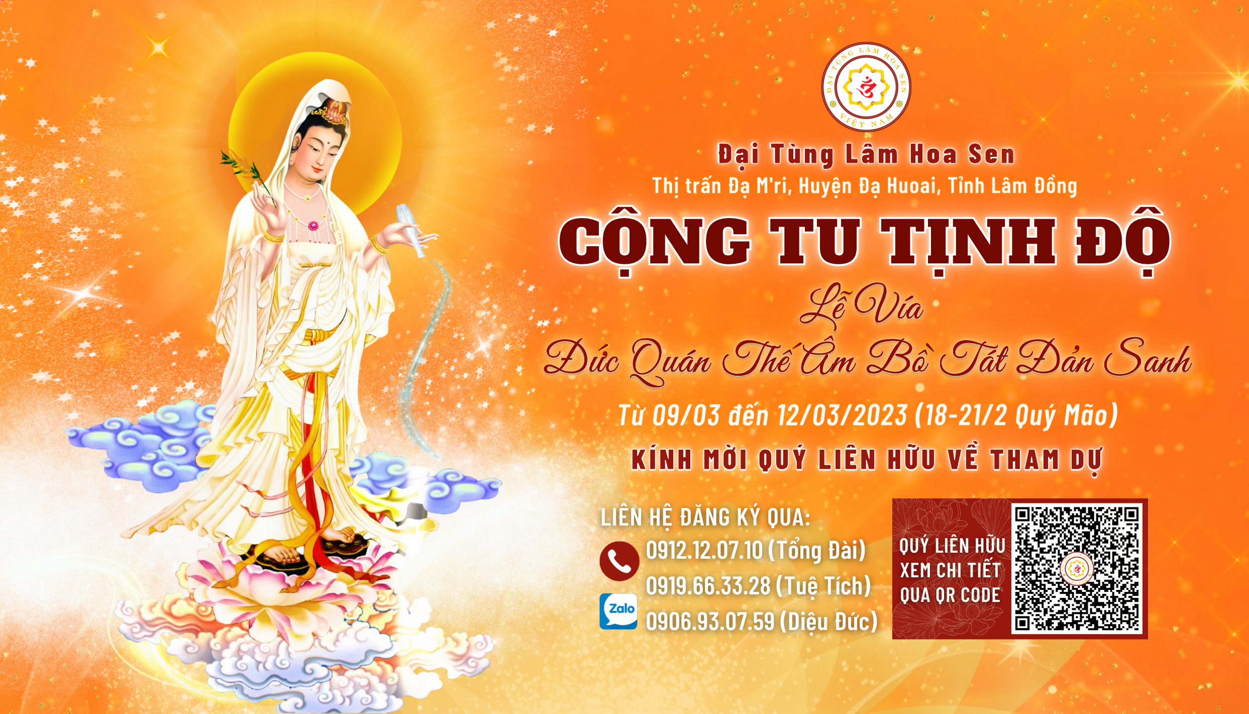 Sắp tới đây, Đại Tùng Lâm Hoa Sen sẽ tổ chức Pháp sự Vía Đức Quán Thế Âm Bồ Tát Đản Sanh | PL.2567 - DL.2023, nhằm tạo duyên lành để các Phật tử, Liên hữu đồng tu thiện nam, tín nữ cùng đại chúng xa gần về tham dự và cộng tu cùng đạo tràng.