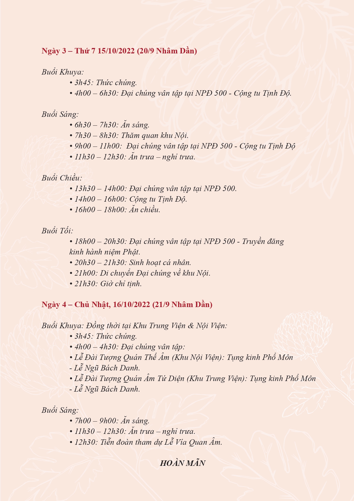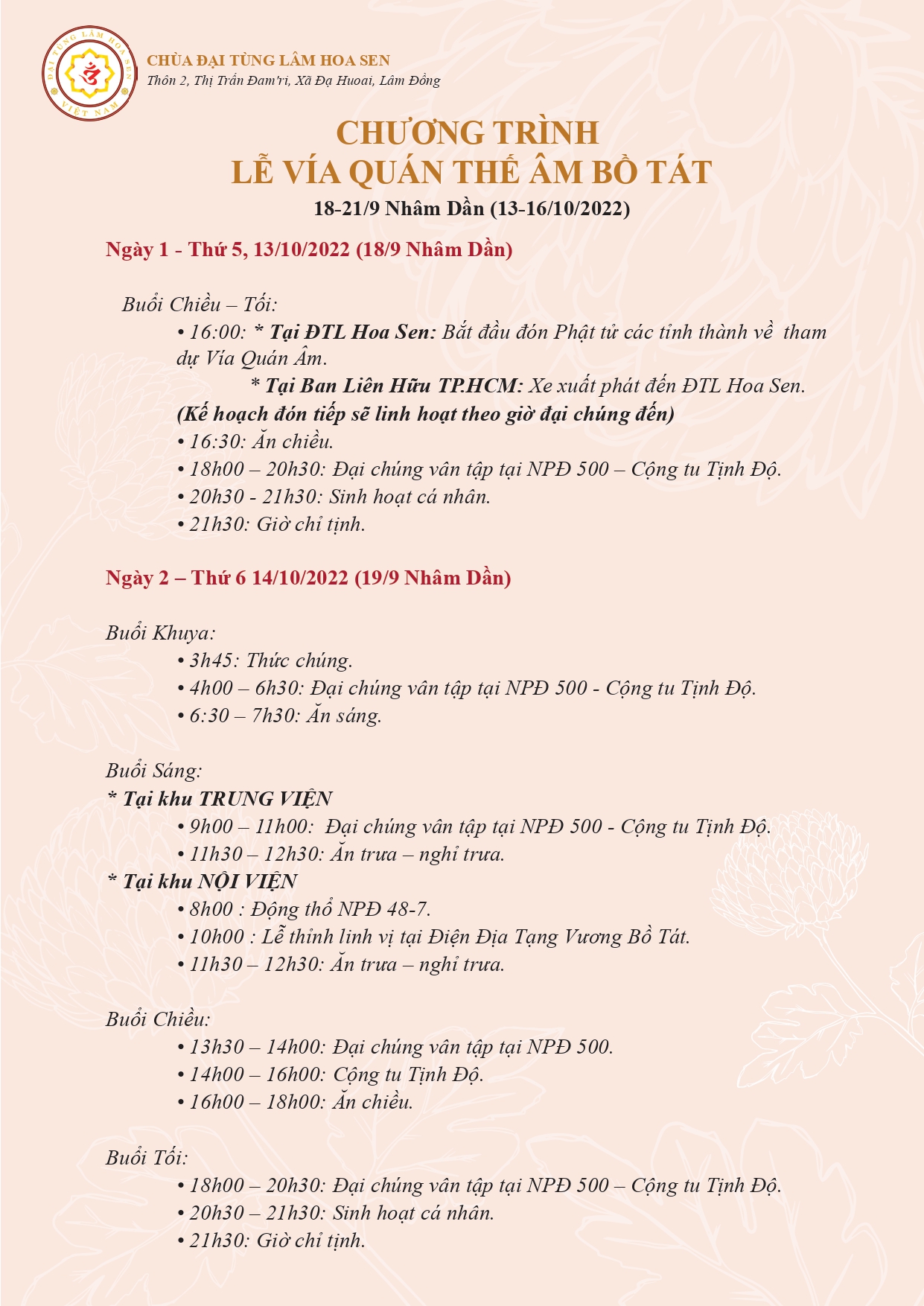 1. Thời gian tổ chức: 13/10 – 16/10/2022 (Nhằm ngày 18 – 21/9/Nhâm Dần)