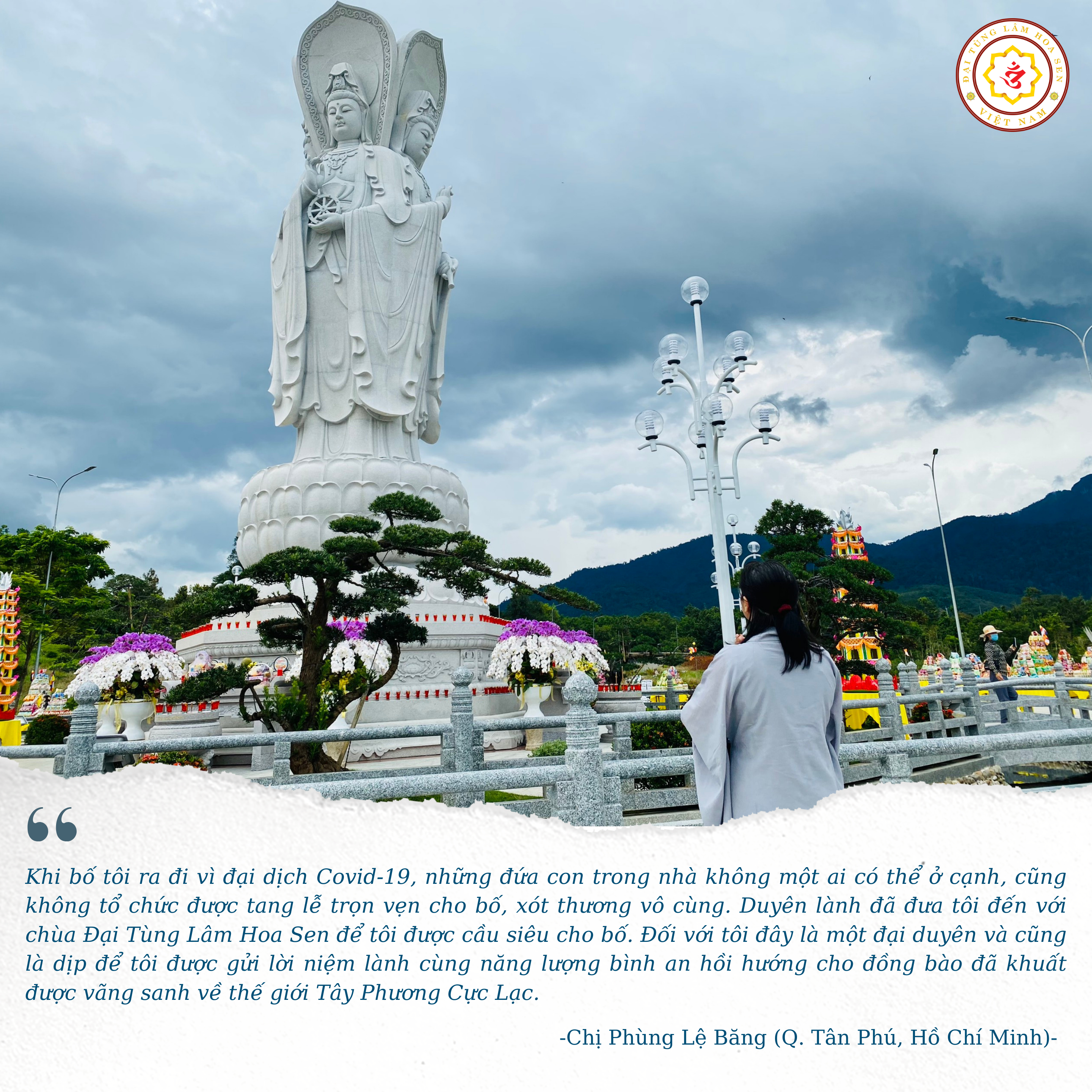 “Sau những ngày giãn cách xã hội, sau khi tâm dịch đã đi qua và lần này được đến Chùa Đại Tùng Lâm Hoa Sen đối với tôi đó là một đại duyên. Các buổi Pháp hội tại đây được tổ chức rất long trọng, trang nghiêm, như một sự xoa dịu đến tất cả các gia đình, trong đó có gia đình tôi. Chính vì vậy, tôi đã tham dự đầy đủ tất cả các buổi Pháp hội chỉ với một tâm niệm là muốn hồi hướng cho bố, cho cửu huyền thất tổ và tất cả đồng bào cả nước đã không may qua đời vì đại dịch Covid vừa qua”.