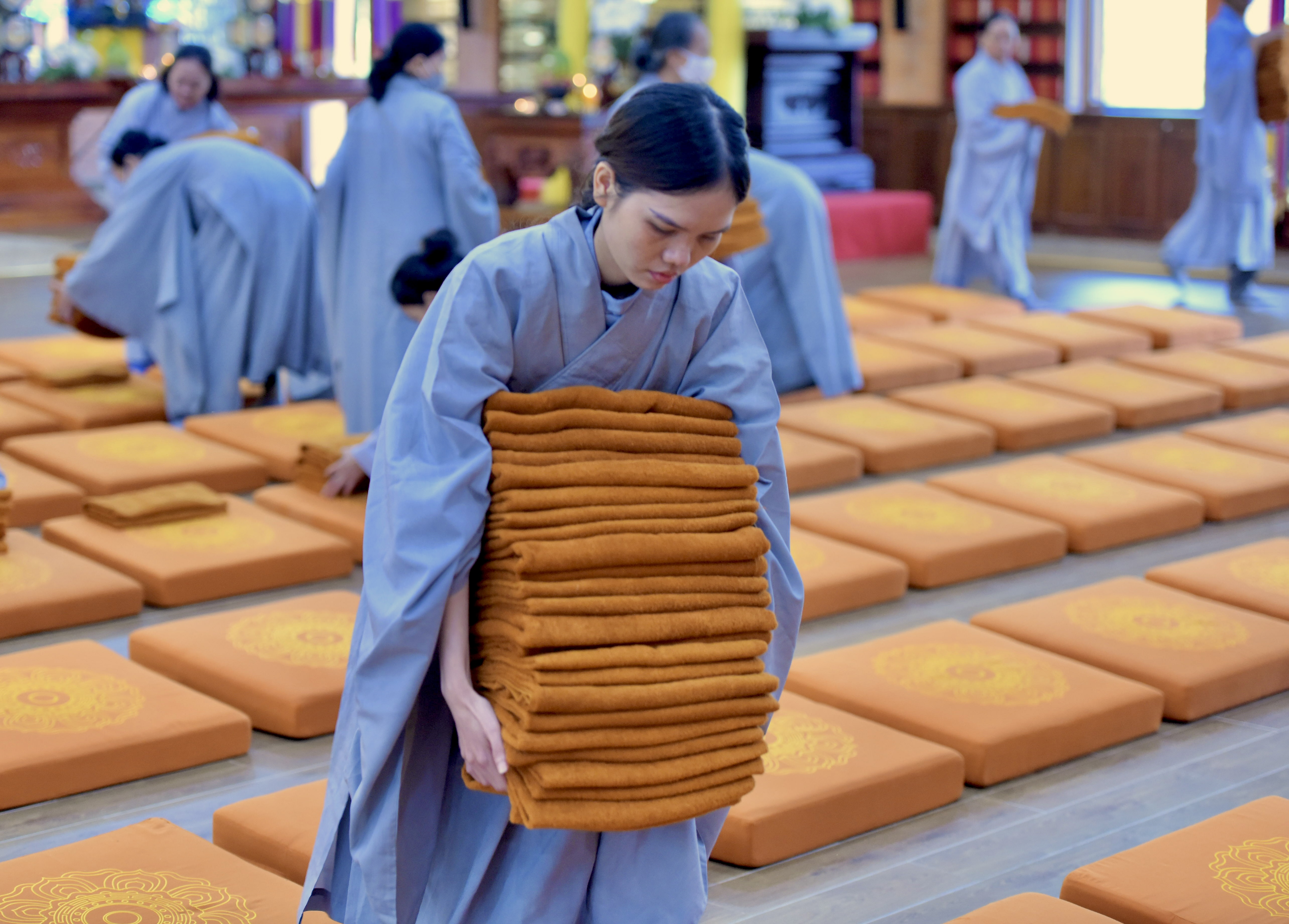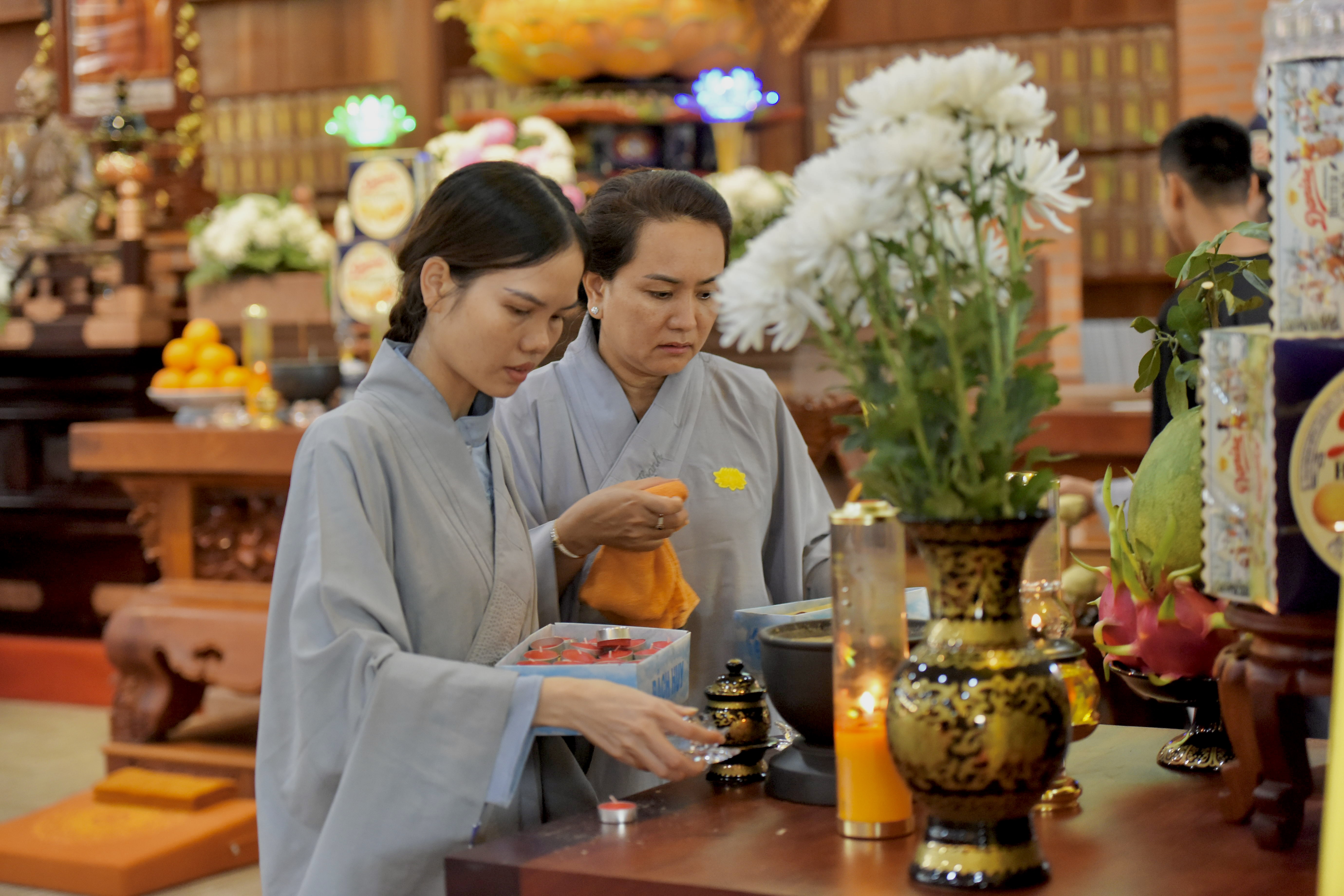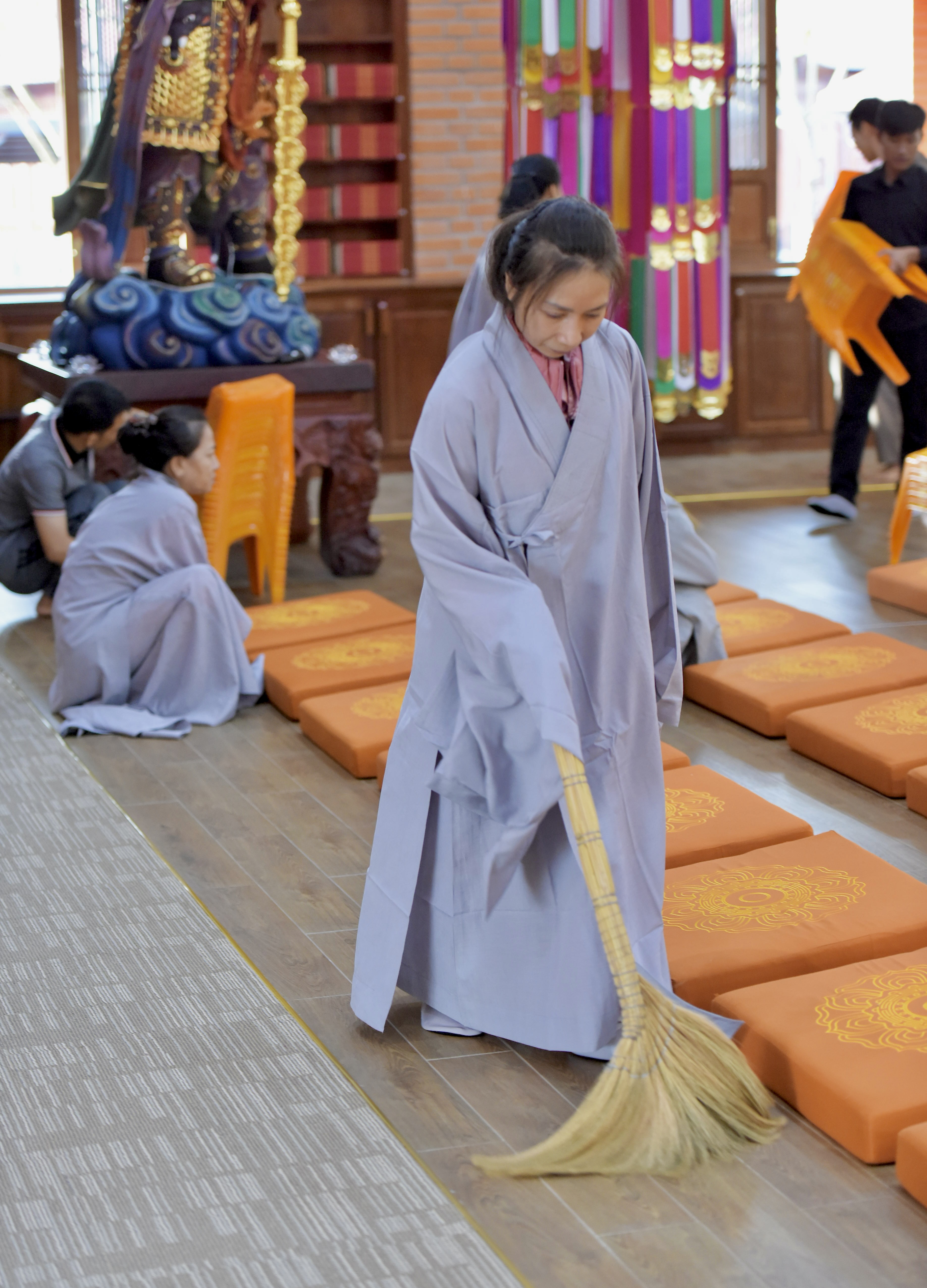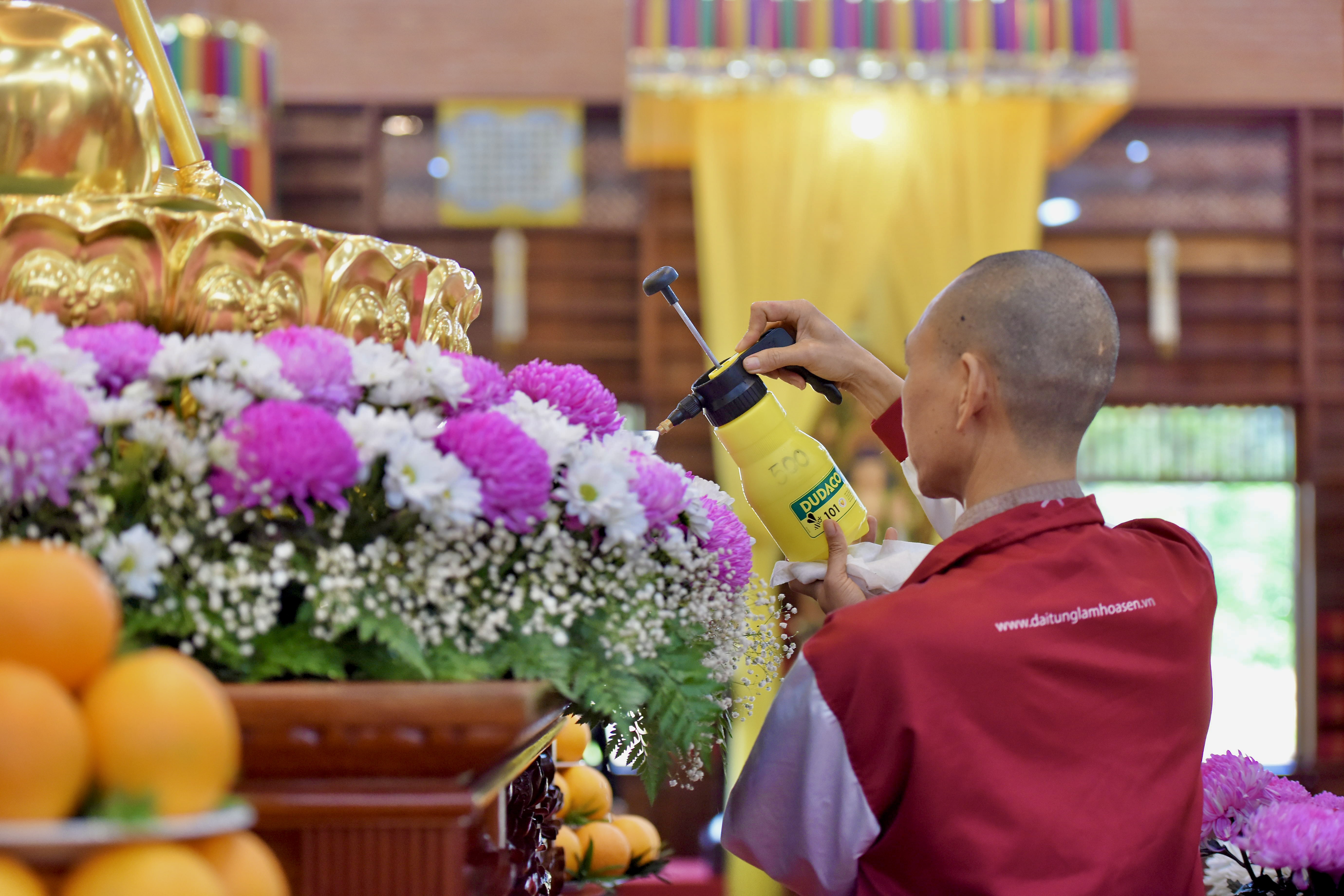 And after each retreat course of diligent perseverance, the masses all shared together the work of observing and dignifying the Buddha Hall with the desire to contribute a part of their efforts, body, and pure mind to serve sentient beings and make offerings to the Buddhas. Making solemn offerings to the Three Jewels is also the fact that the public was practicing the Buddha's teachings on generosity to beautify their own body and mind, thereby accumulating merit and increasing happiness for themselves.