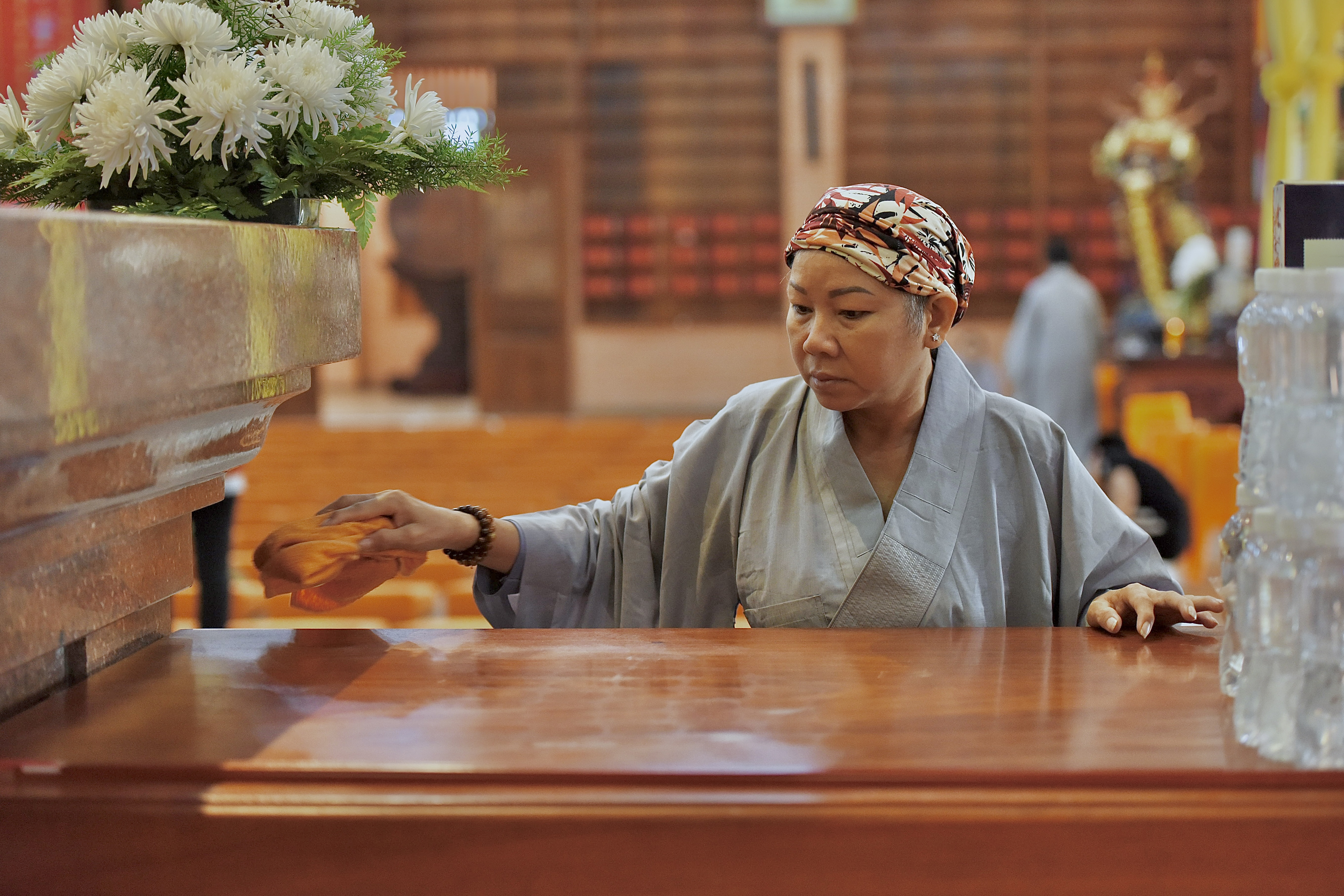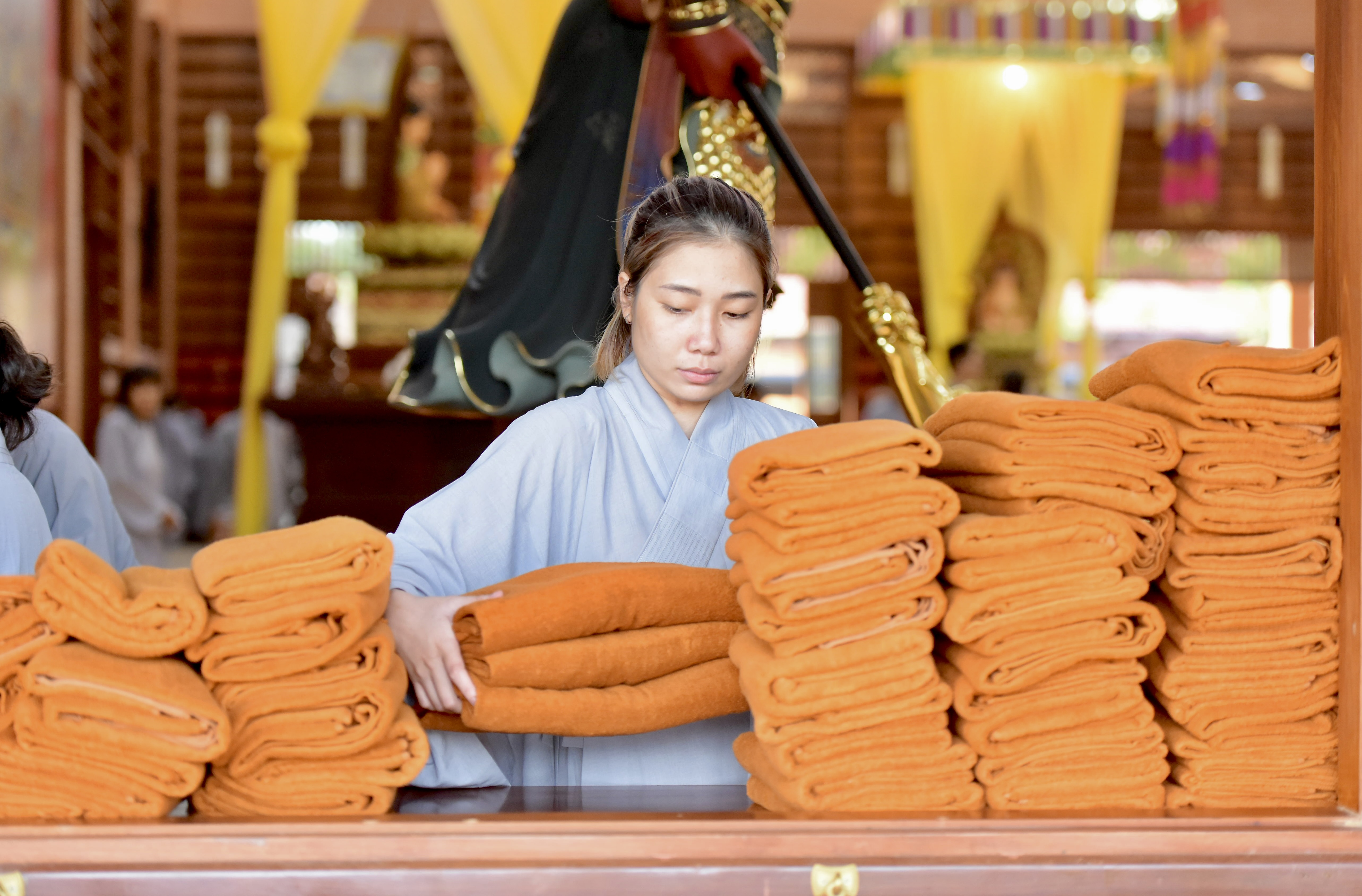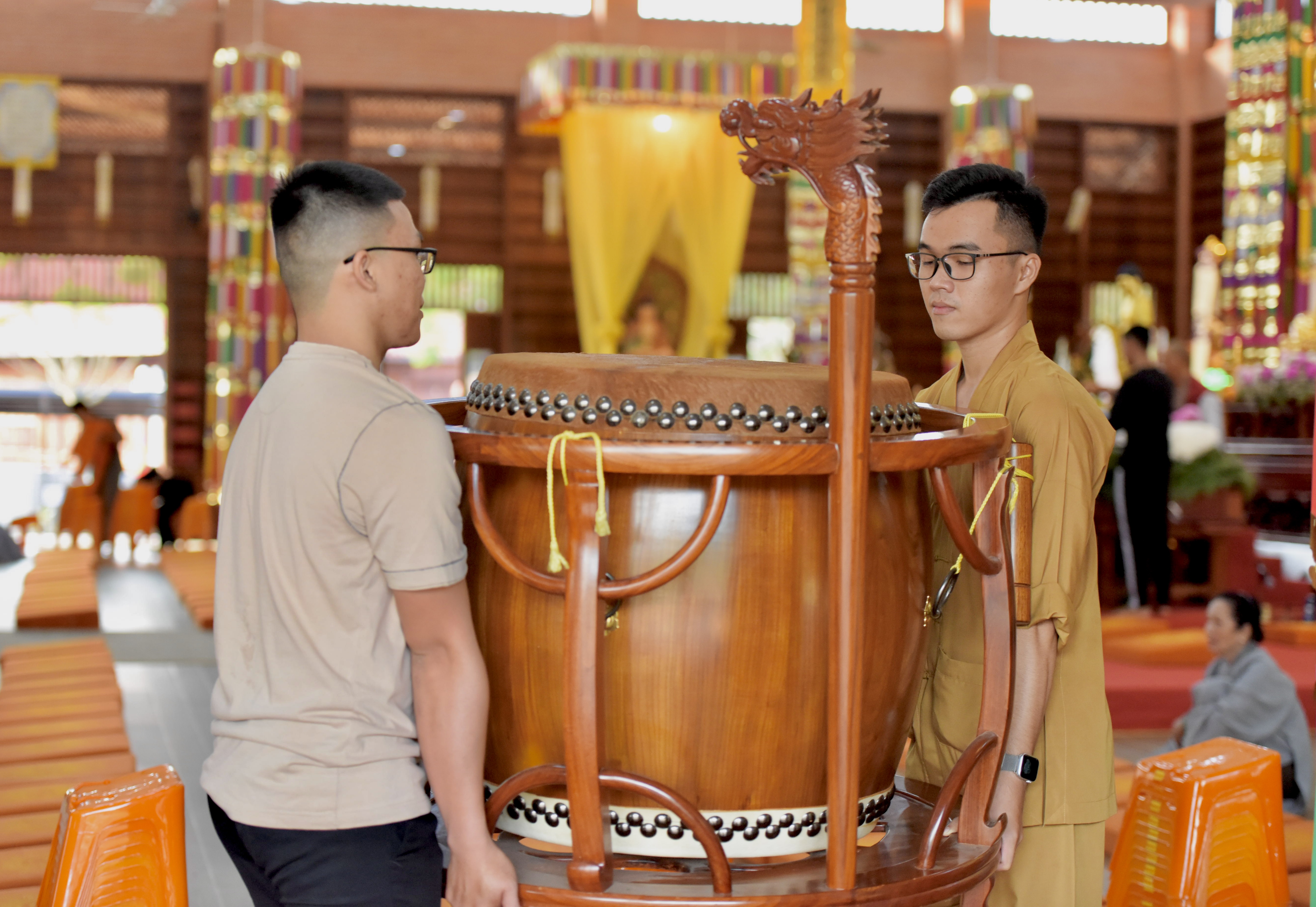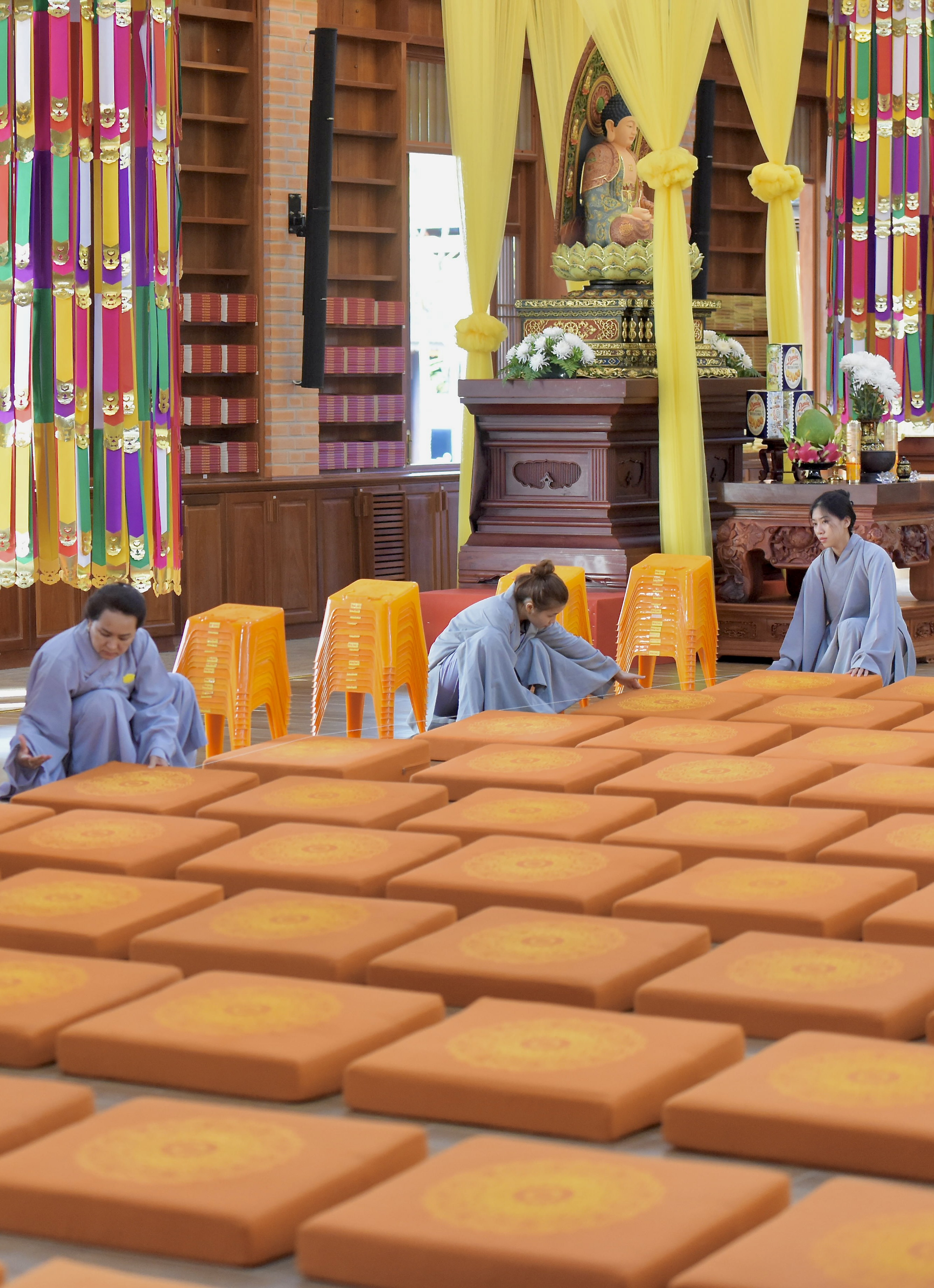 And after each retreat course of diligent perseverance, the masses all shared together the work of observing and dignifying the Buddha Hall with the desire to contribute a part of their efforts, body, and pure mind to serve sentient beings and make offerings to the Buddhas. Making solemn offerings to the Three Jewels is also the fact that the public was practicing the Buddha's teachings on generosity to beautify their own body and mind, thereby accumulating merit and increasing happiness for themselves.