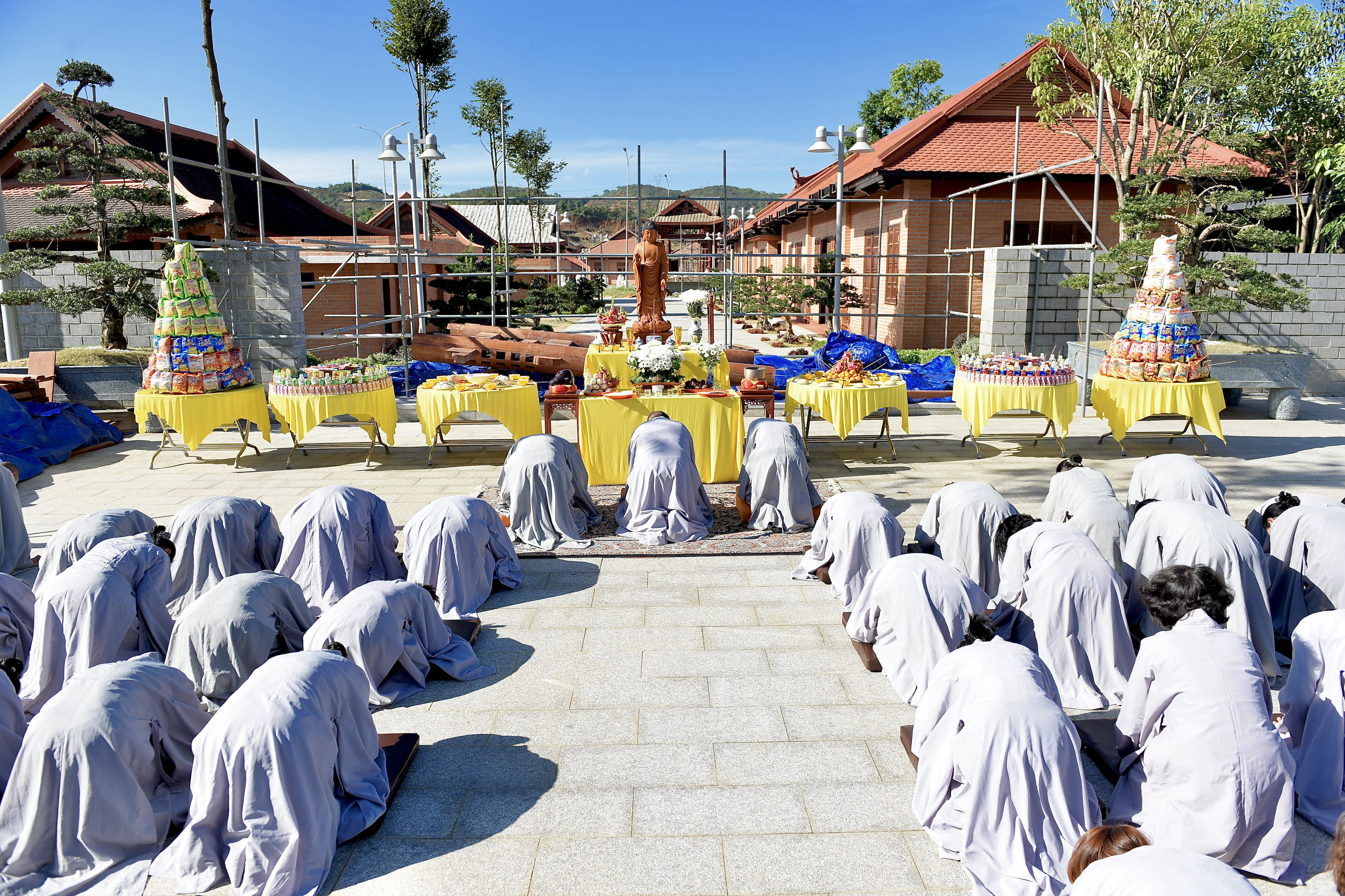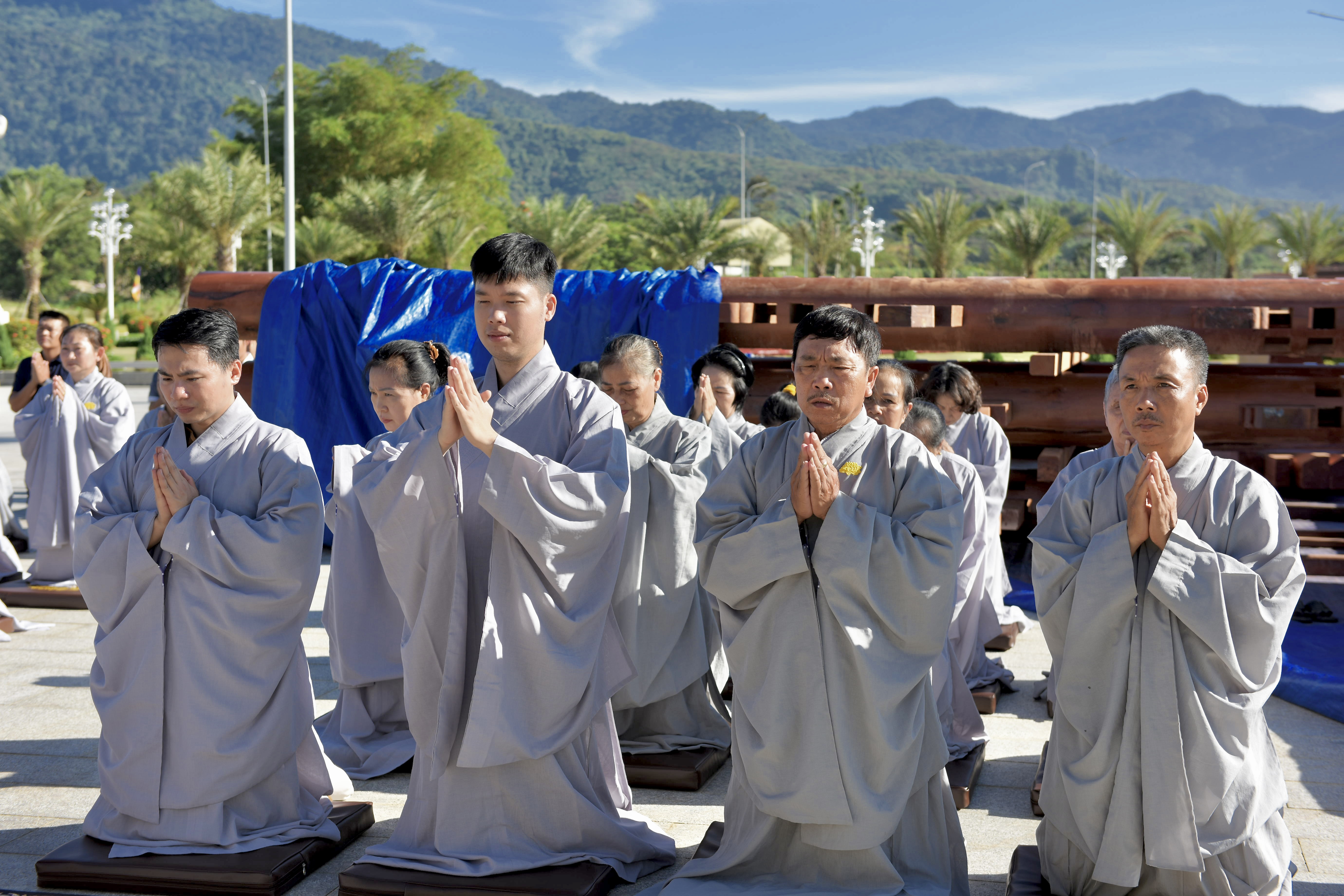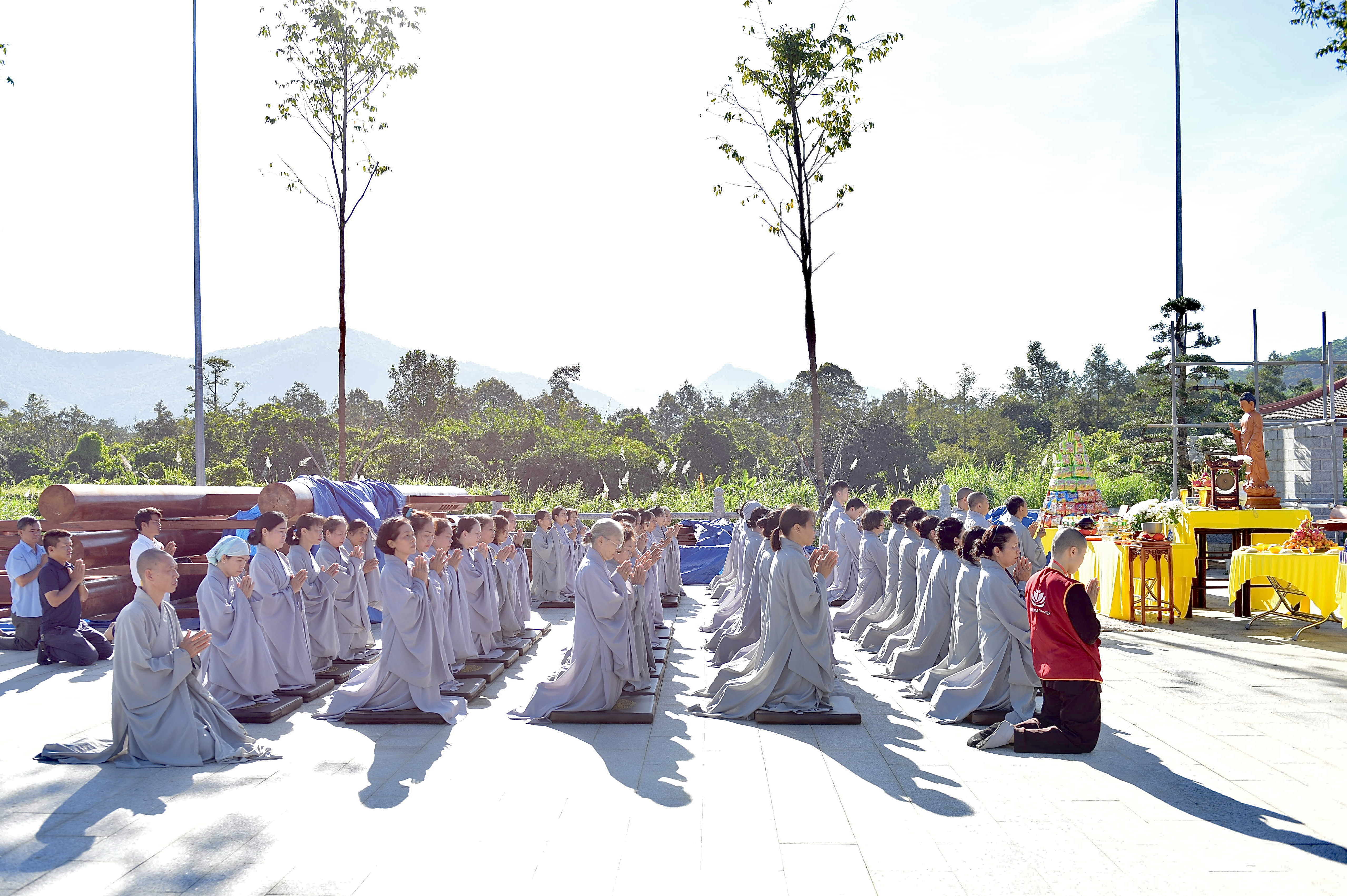 With that sacred mission and significance, in the framework of the gate erection ceremony, the entire Dai Tung Lam Hoa Sen association reverently worshipped the Three Jewels and pledged their devotion to the Ten-Direction Buddhas, the Compassionate Father Amitabha, the Great Bodhisattvas, the Holy Monks, and other compassionate beings who reside on the B'Nom Lu'Mu mountain, to witness and radiate longevity and blessings to the ceremony's successful completion.