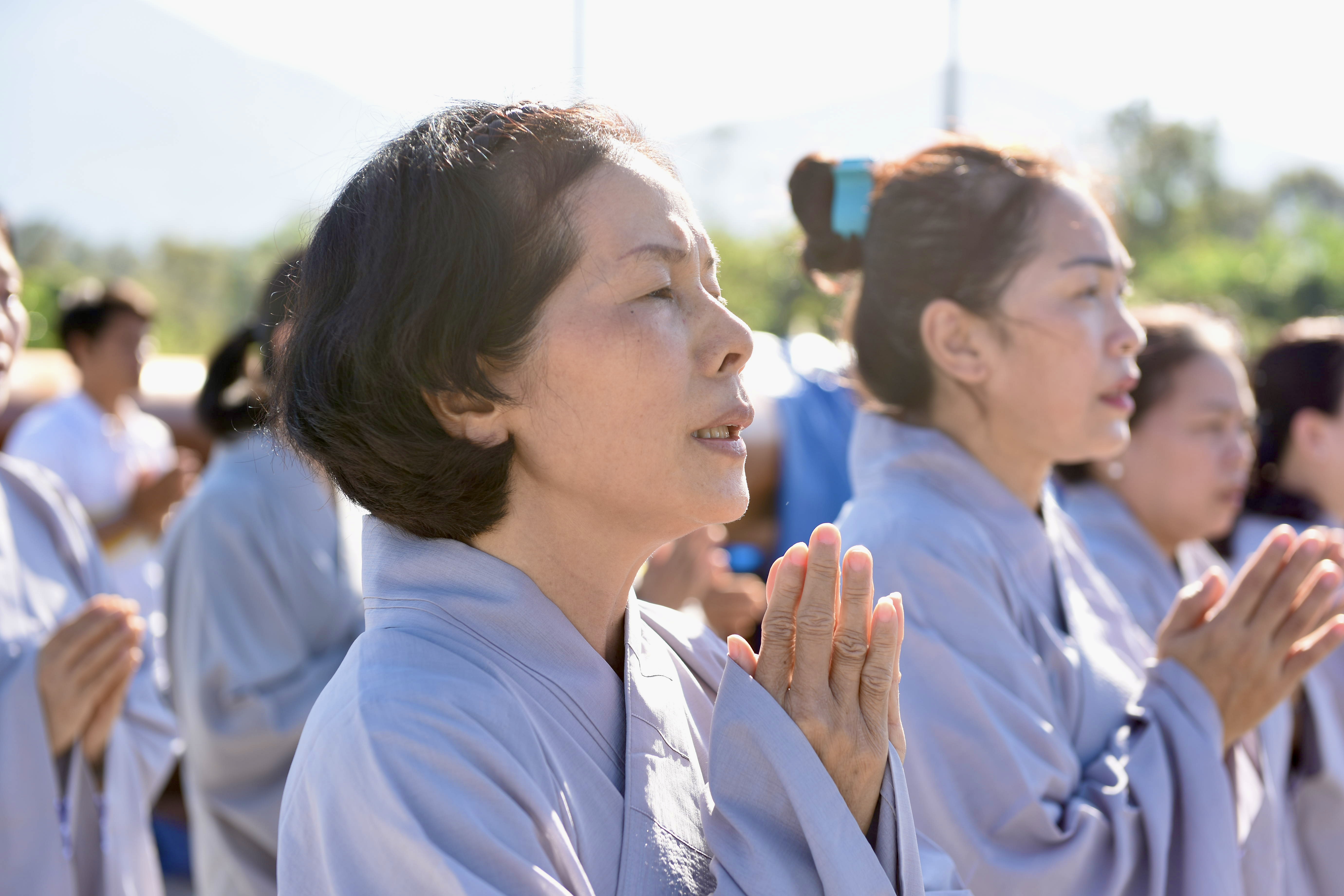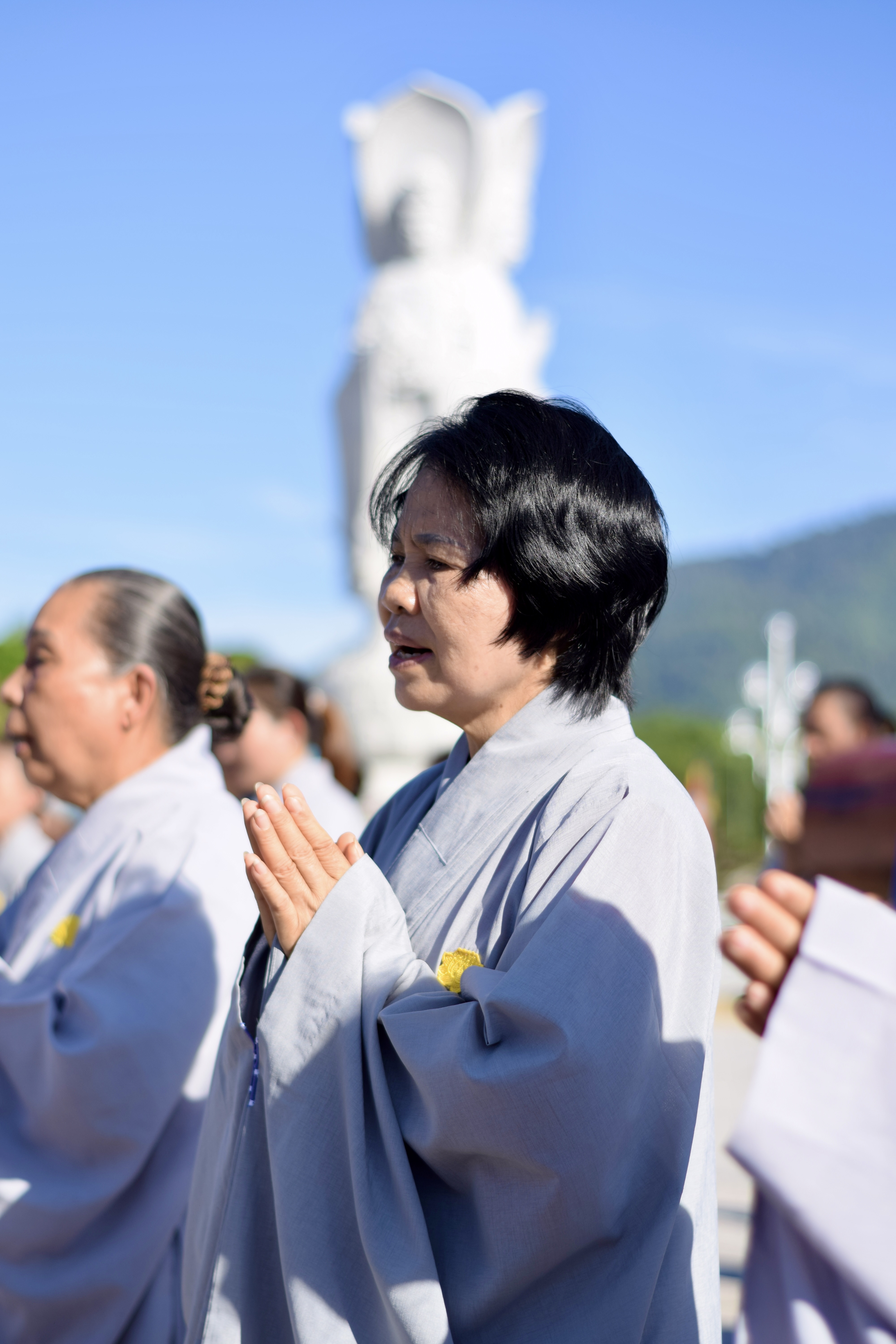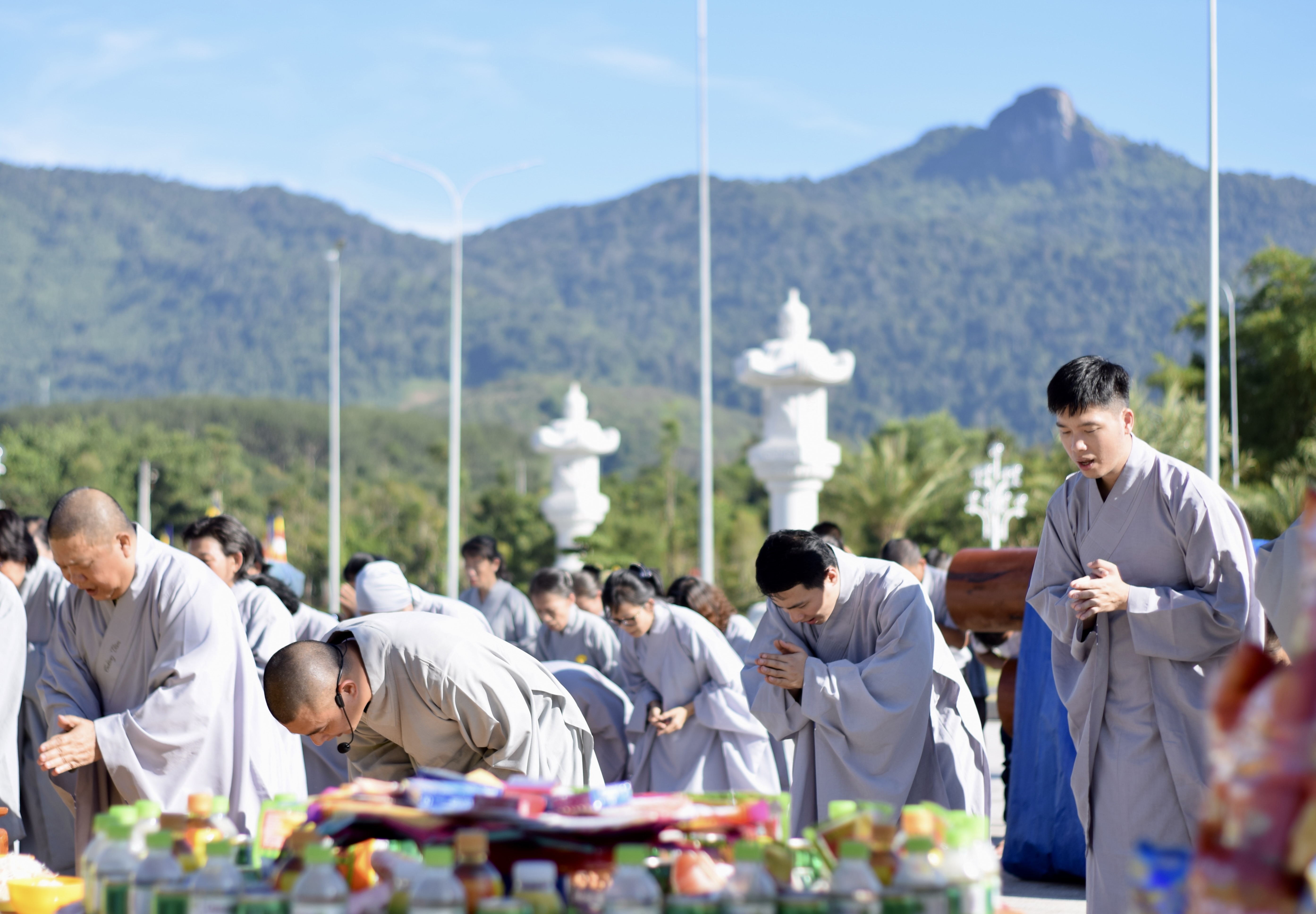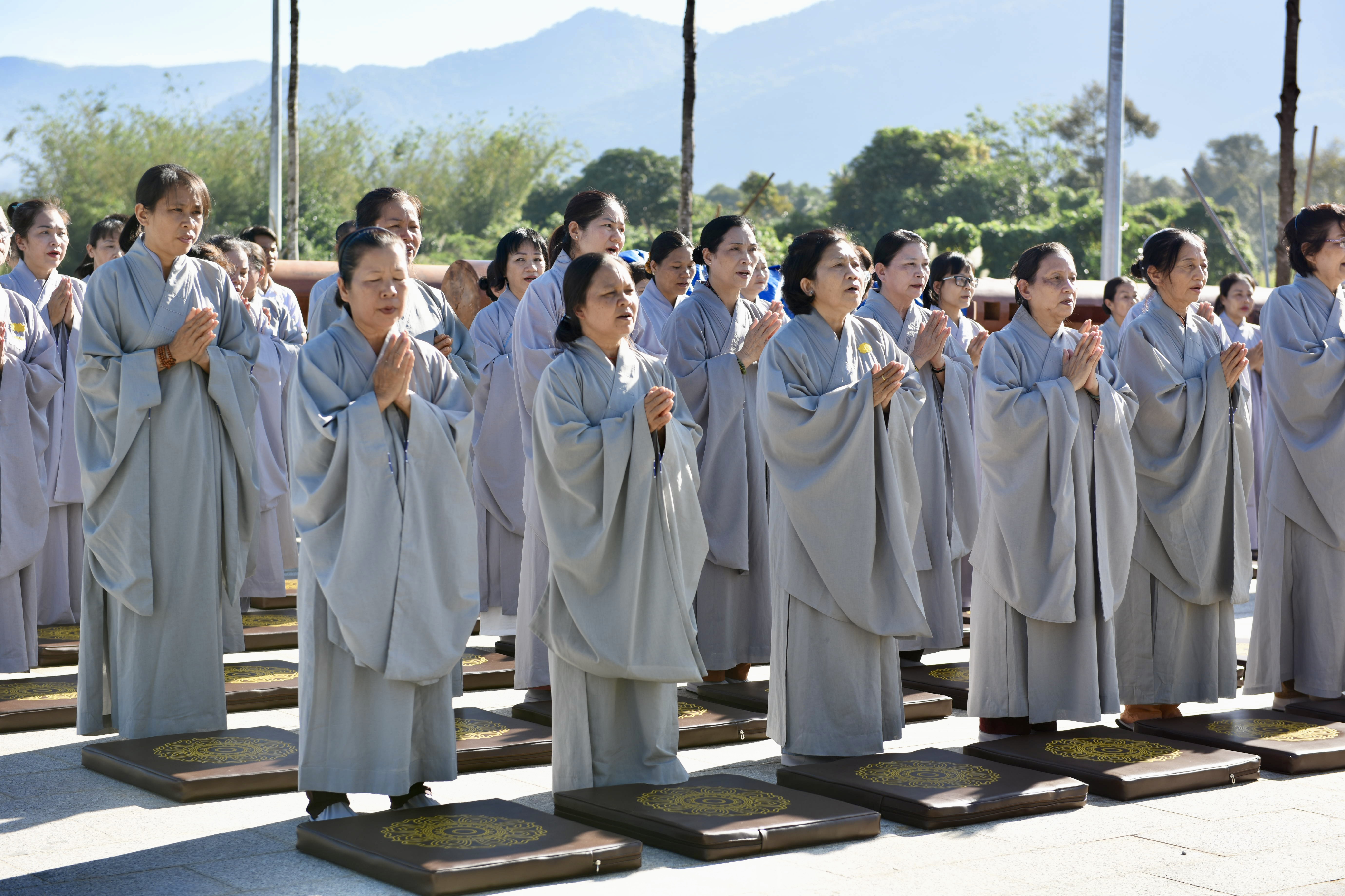 With that sacred mission and significance, in the framework of the gate erection ceremony, the entire Dai Tung Lam Hoa Sen association reverently worshipped the Three Jewels and pledged their devotion to the Ten-Direction Buddhas, the Compassionate Father Amitabha, the Great Bodhisattvas, the Holy Monks, and other compassionate beings who reside on the B'Nom Lu'Mu mountain, to witness and radiate longevity and blessings to the ceremony's successful completion.